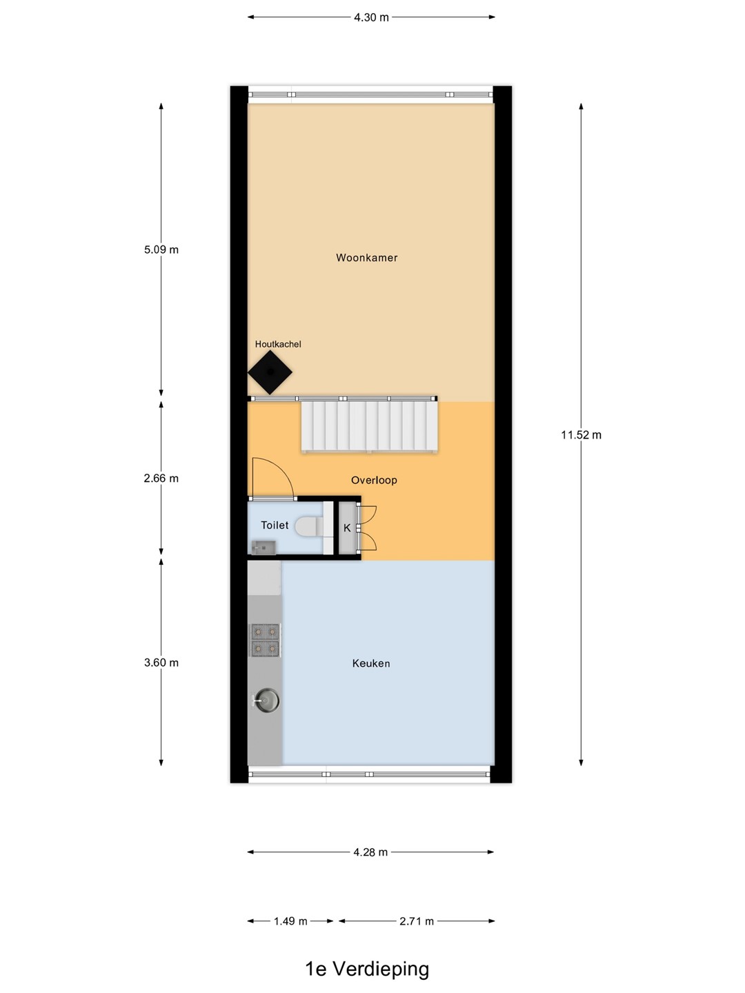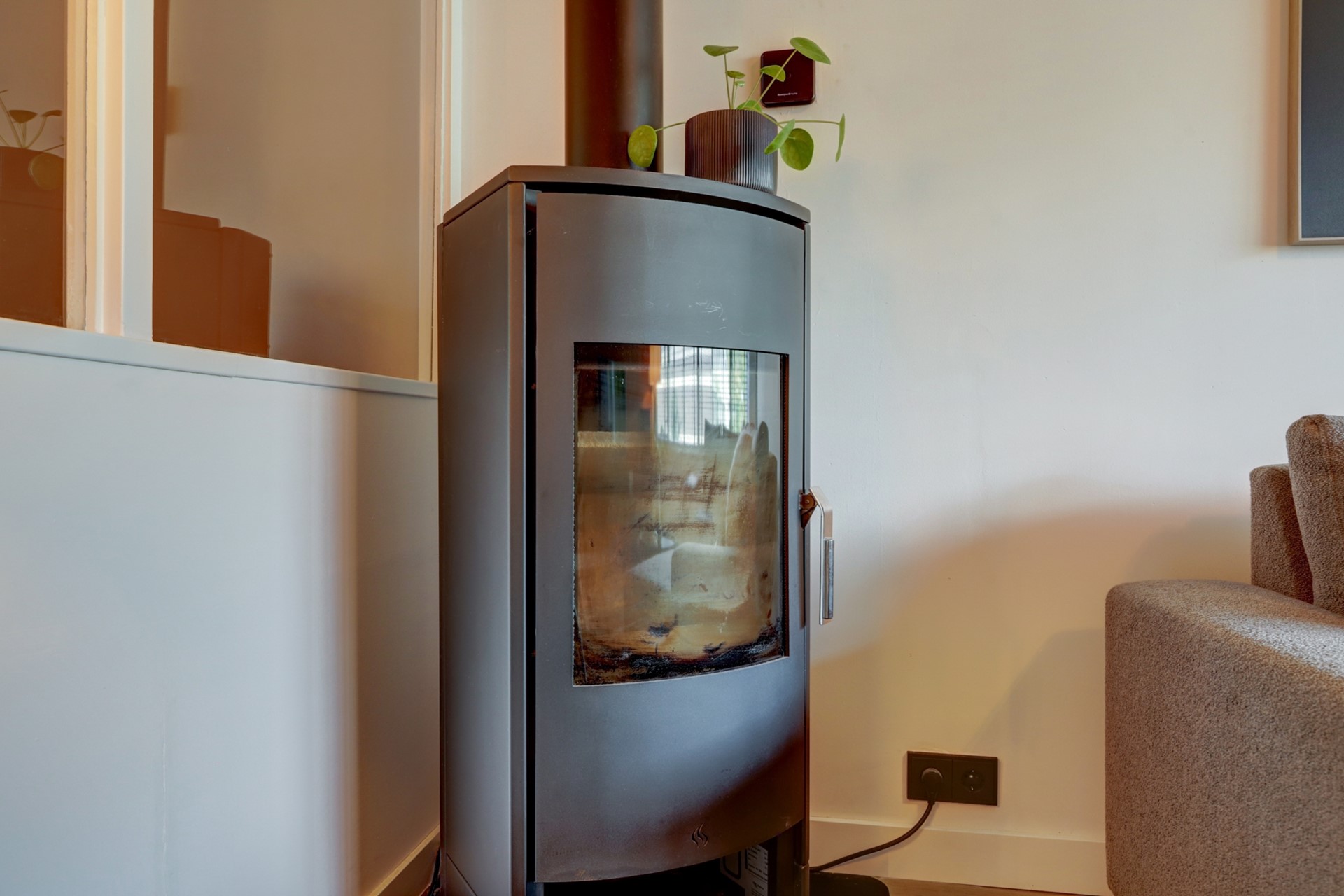 Op de eerste verdieping vind je een overloop met vaste kast, een toilet met fonteintje en een gezellige woonkamer (ca. 22 m²) met houtkachel en uitzicht op groen. Aan de voorzijde ligt de ruime woon-/leefkeuken (ca. 15,5 m²), voorzien van een keukenblok met spoelbak, koelkast, 5-pits gaskookplaat, afzuigkap, combimagnetron en vaatwasser (deze is defect).