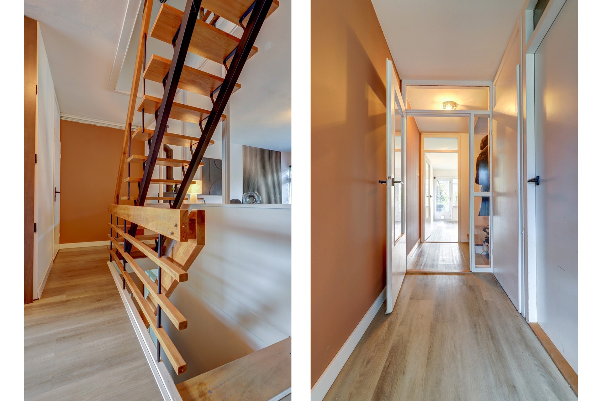Via de overdekte entree stap je binnen in de hal met meterkast, trapopgang en toegang tot de inpandige berging/garage (ca. 19 m²). Aan de tuinzijde bevindt zich een tuin-/werk-/slaapkamer met wasmachine- en drogeraansluiting én een deur naar de achtertuin.