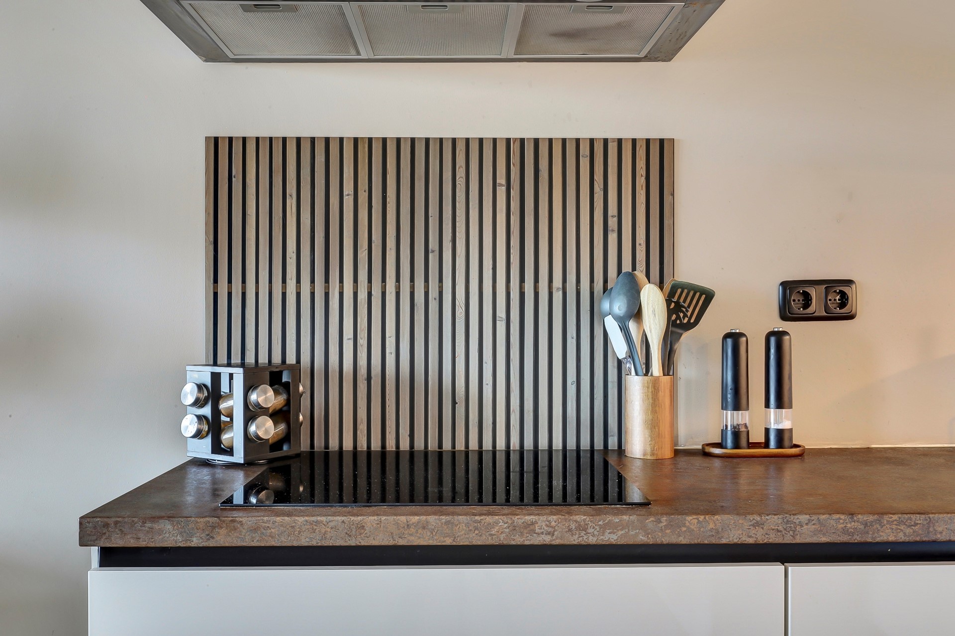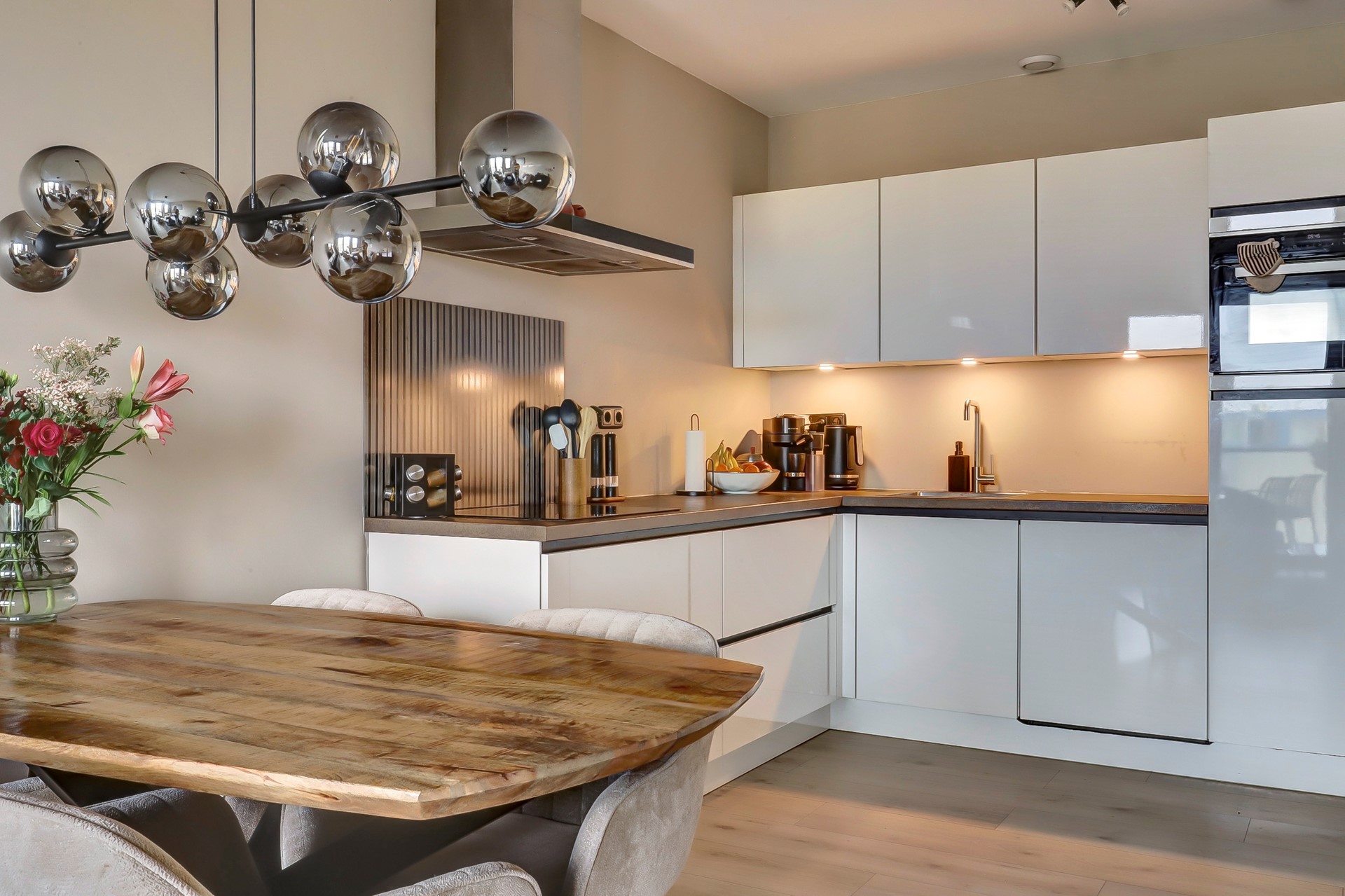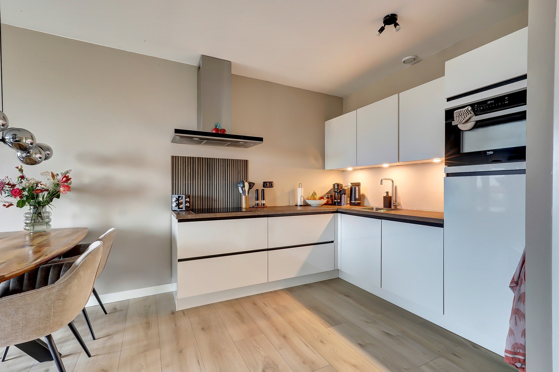 De open keuken is voorzien van een modern keukenblok, geplaatst in 2020 en volledig uitgerust voor al je kookavonturen met onder meer een spoelbak, vaatwasser, combi-oven, koelkast, inductiekookplaat, afzuigkap en inbouwspotjes.