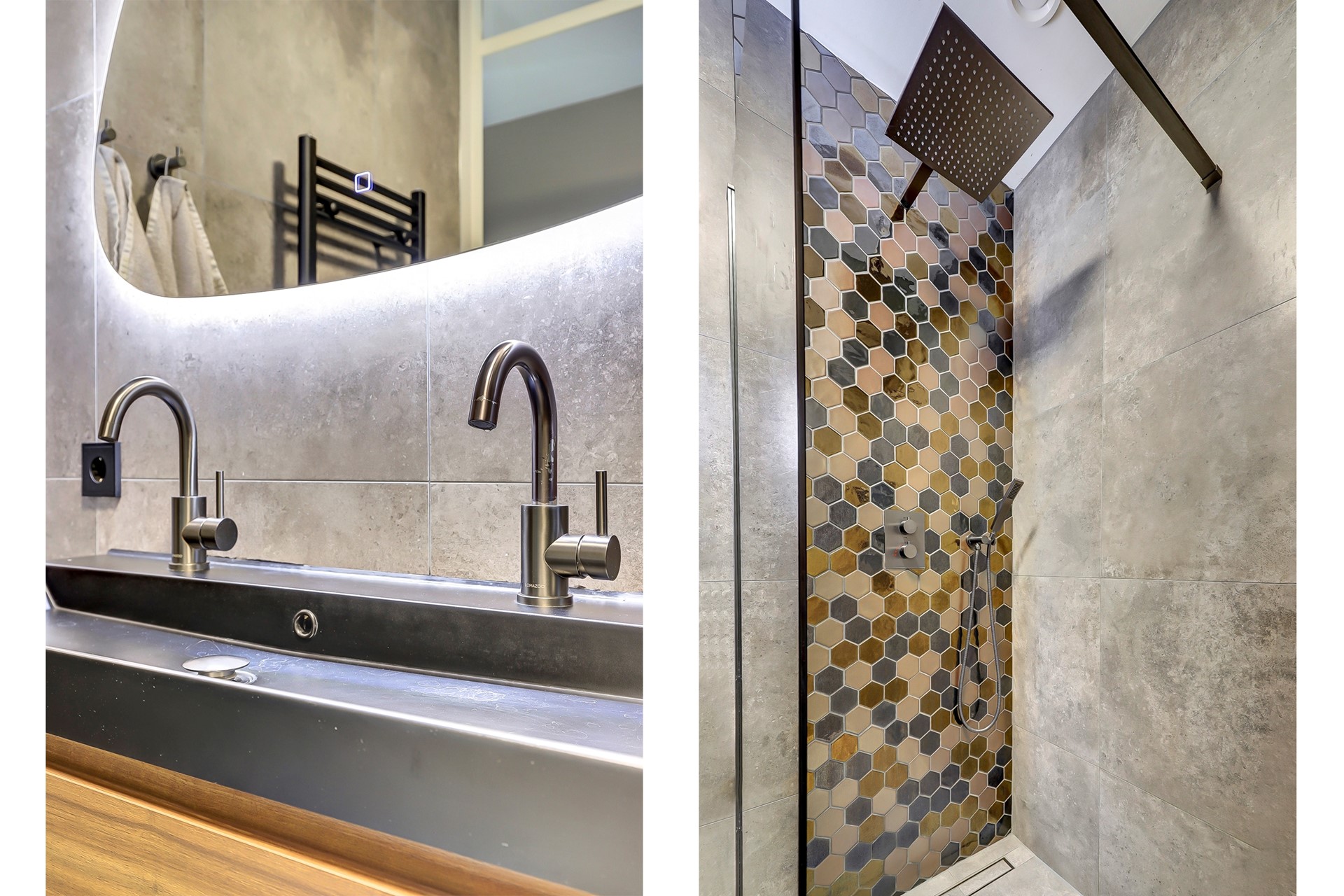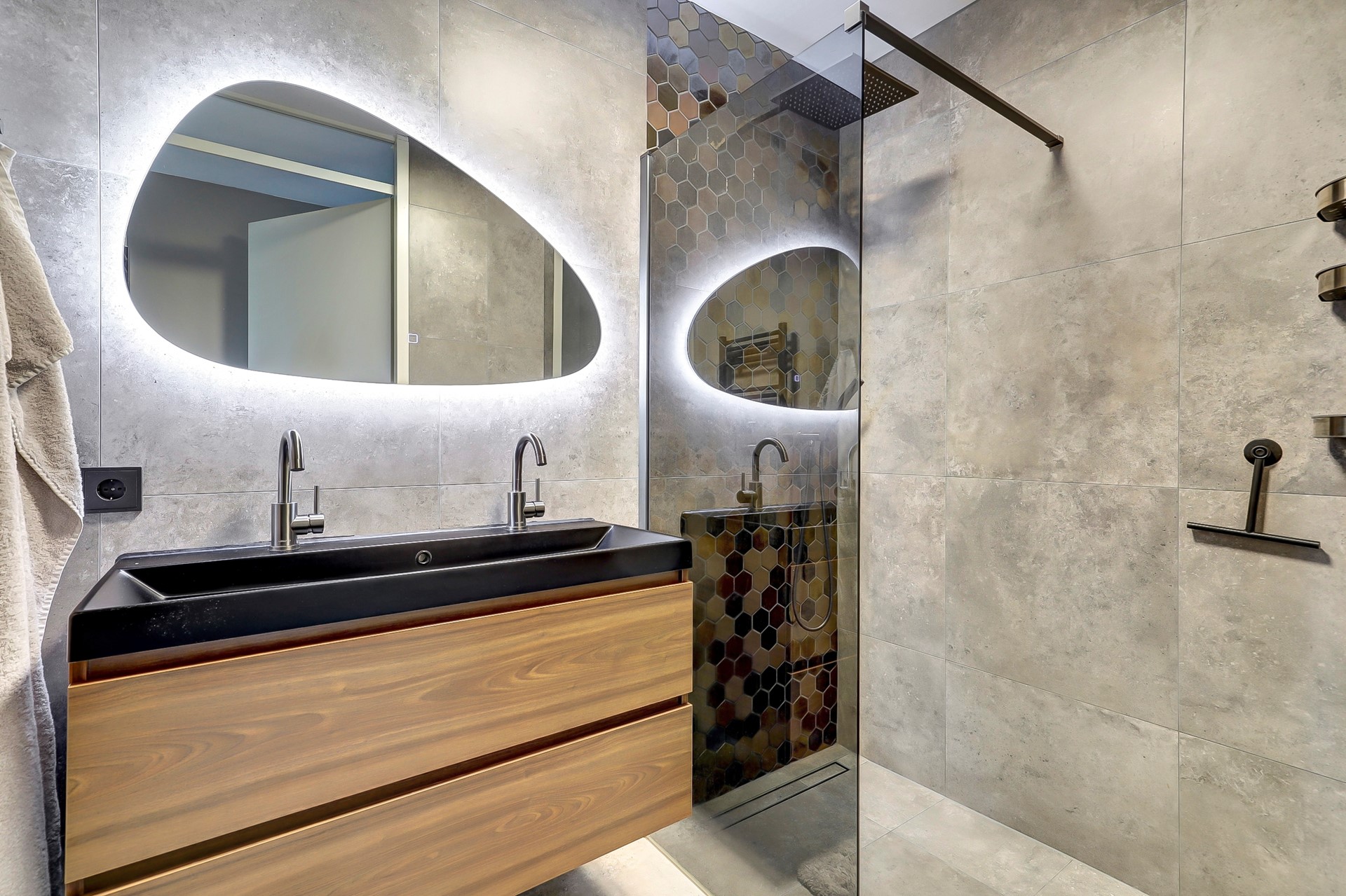 De badkamer is in 2024 geheel vernieuwd en beschikt over een wastafel met twee kranen en meubel, ruime inloopdouche, designradiator en is fraai betegeld.