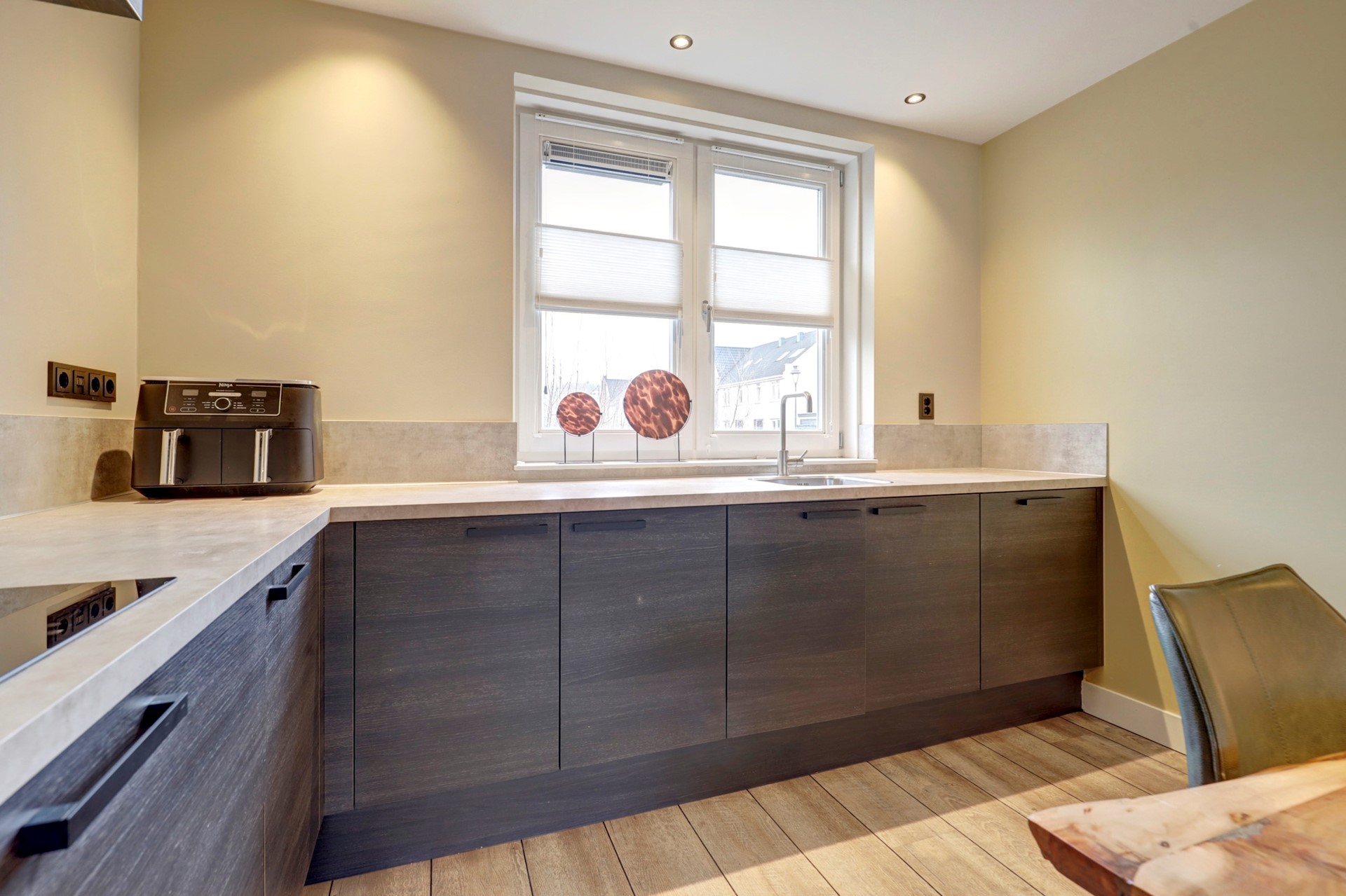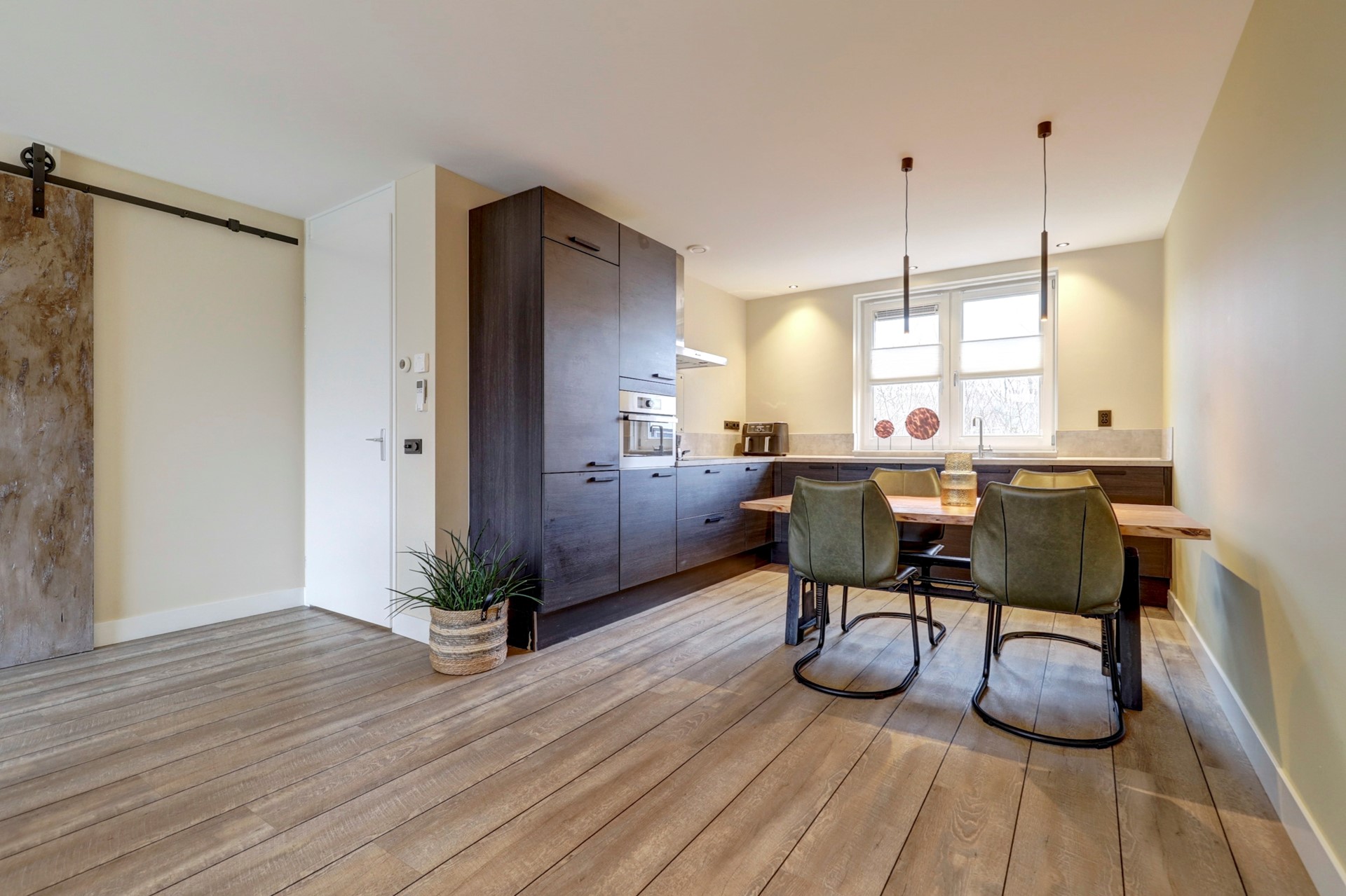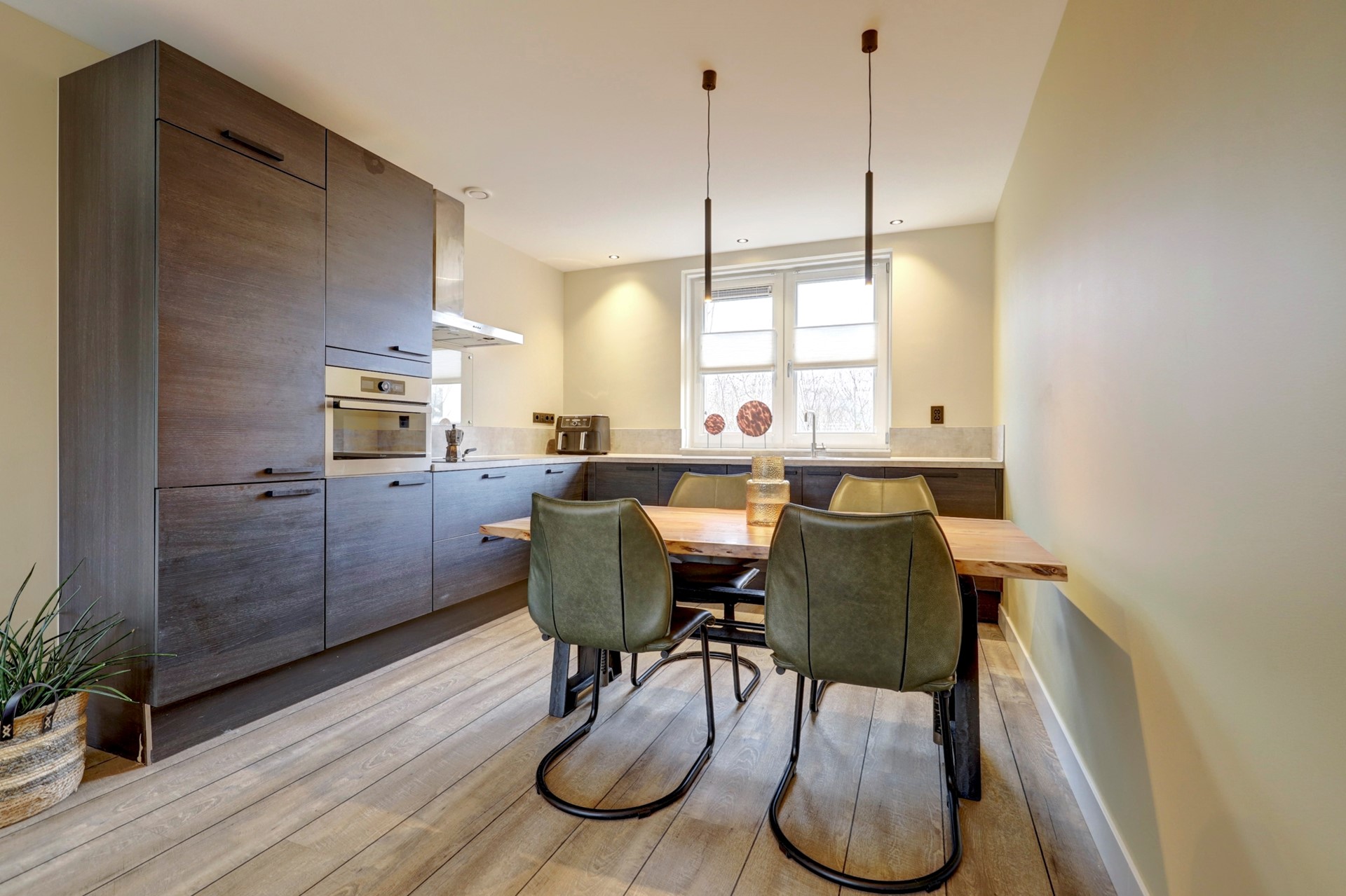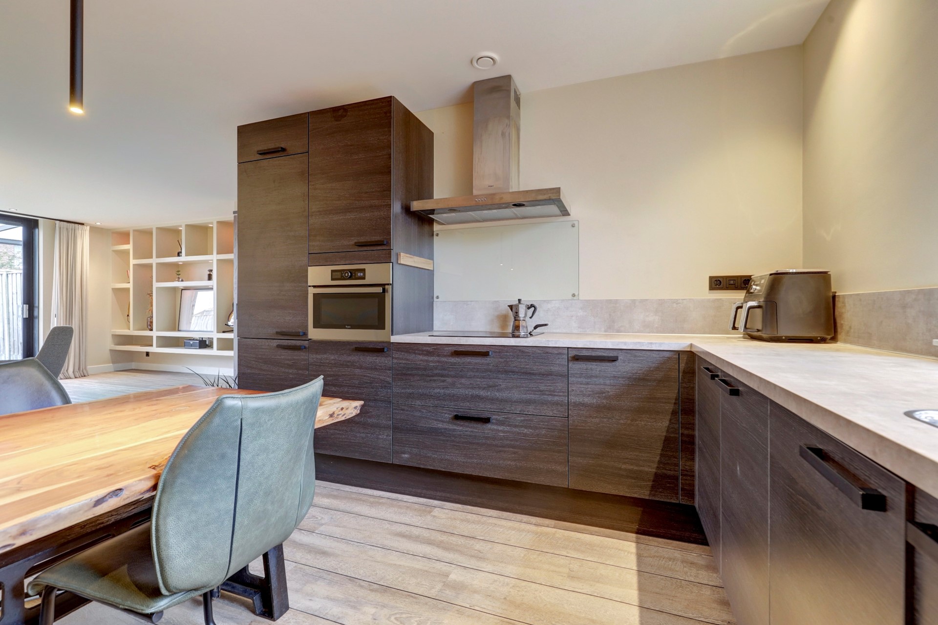 De open keuken bevindt zich aan de voorzijde van de woning en heeft een praktische L-opstelling. De keuken is uitgerust met diverse inbouwapparatuur zoals een inductiekookplaat, afzuigkap, koel-vriescombinatie, vaatwasser, combi-oven en een inbouwboiler voor direct heet water. Tijdens het koken heeft u een prettig uitzicht over het groen en de waterpartij aan de voorzijde.