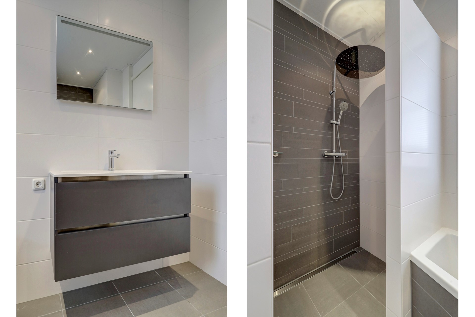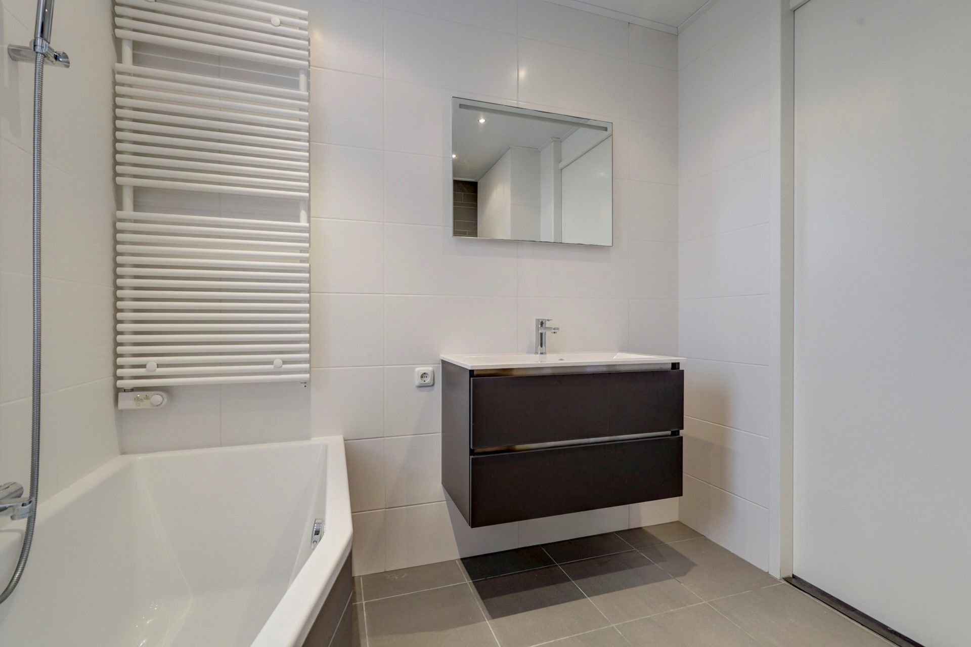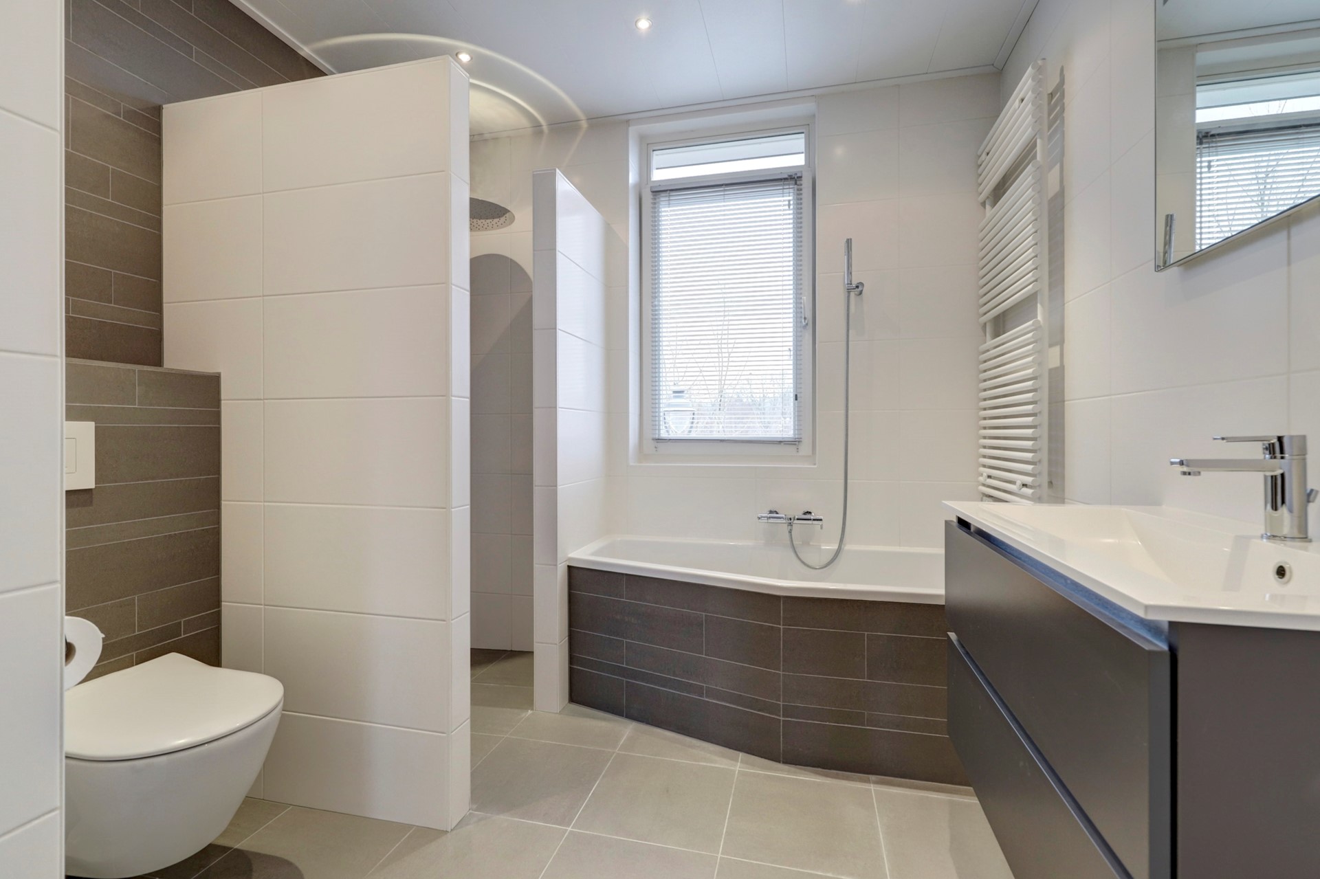De moderne badkamer is tot aan het plafond betegeld en voorzien van een wastafelmeubel, ruime inloopdouche, ligbad, zwevend tweede toilet, designradiator en inbouwspotjes met radio.