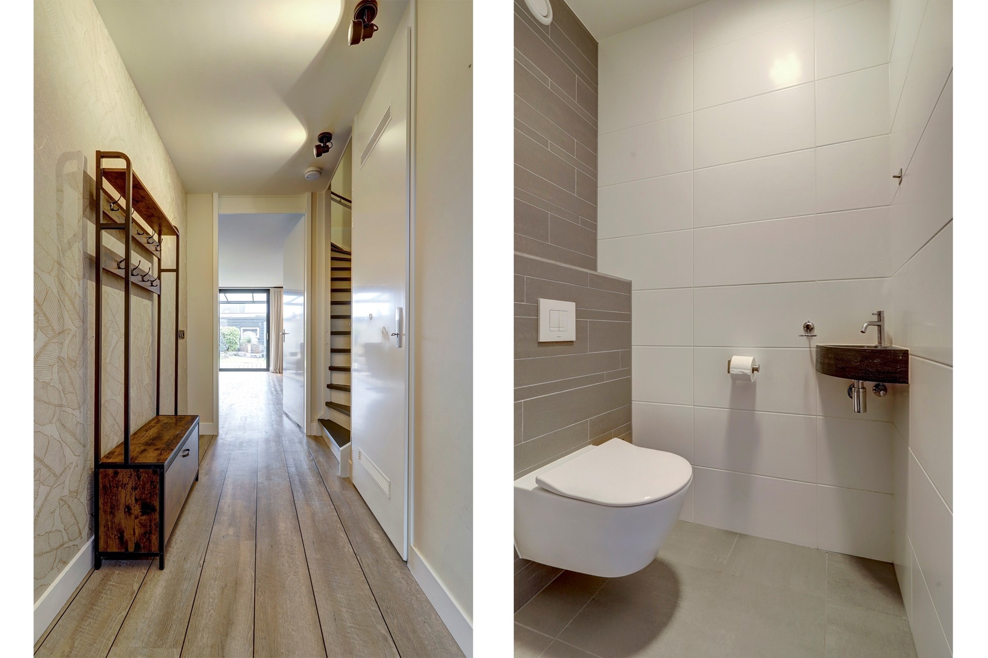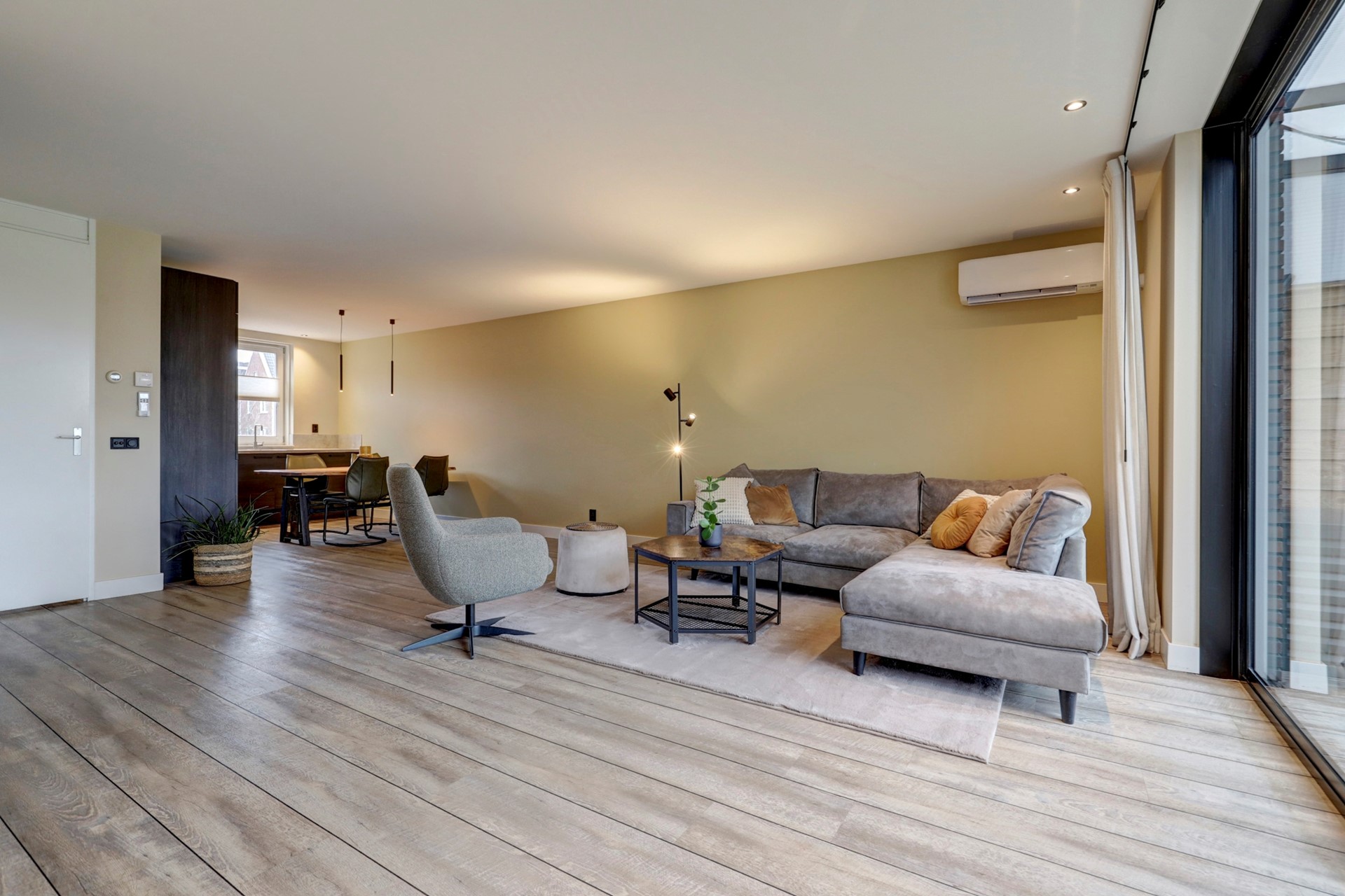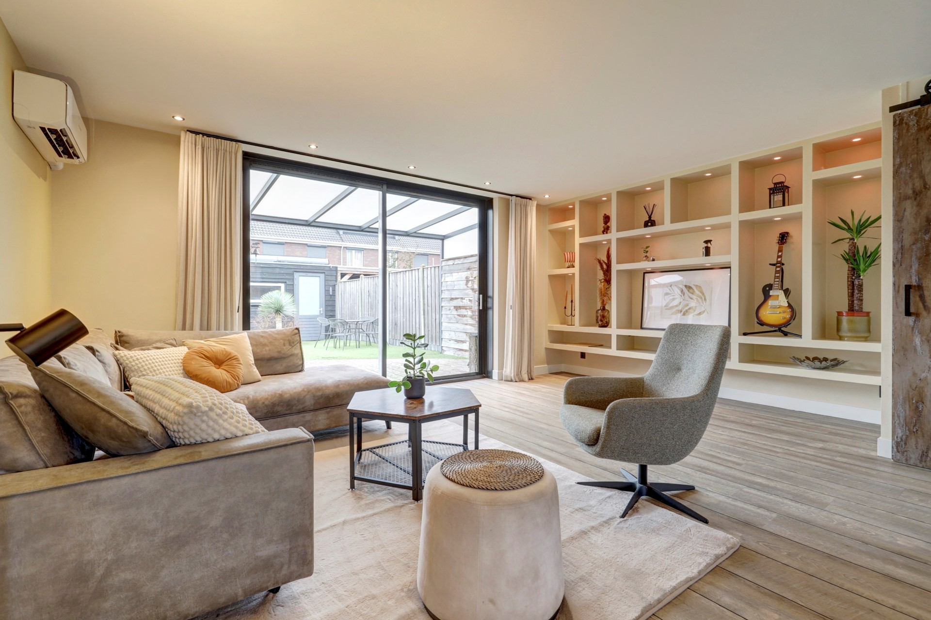 Entree, ruime hal met meterkast, opbouwspotjes en toegang tot een modern toilet met fonteintje en de trapopgang. De royale woonkamer (ca. 30 m²) is tuingericht en strak afgewerkt met een fraaie PVC-vloer met brede planken en hoge plinten. Daarnaast beschikt de woonkamer over een praktische trapkast met schuifdeur, een vaste vakkenkast, inbouwspotjes en een airco-unit. Via de schuifpui loopt u zo de fraai aangelegde achtertuin in.