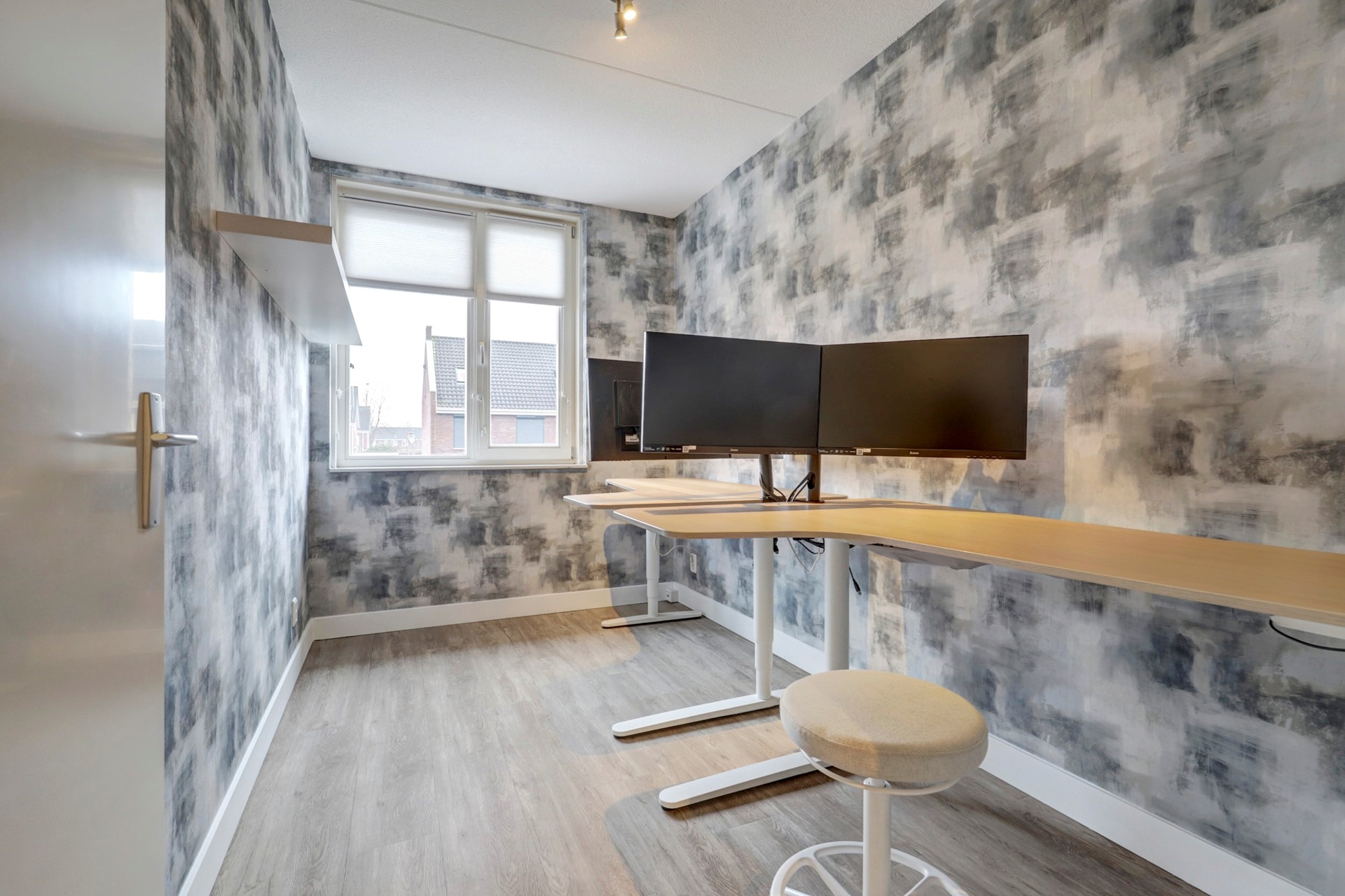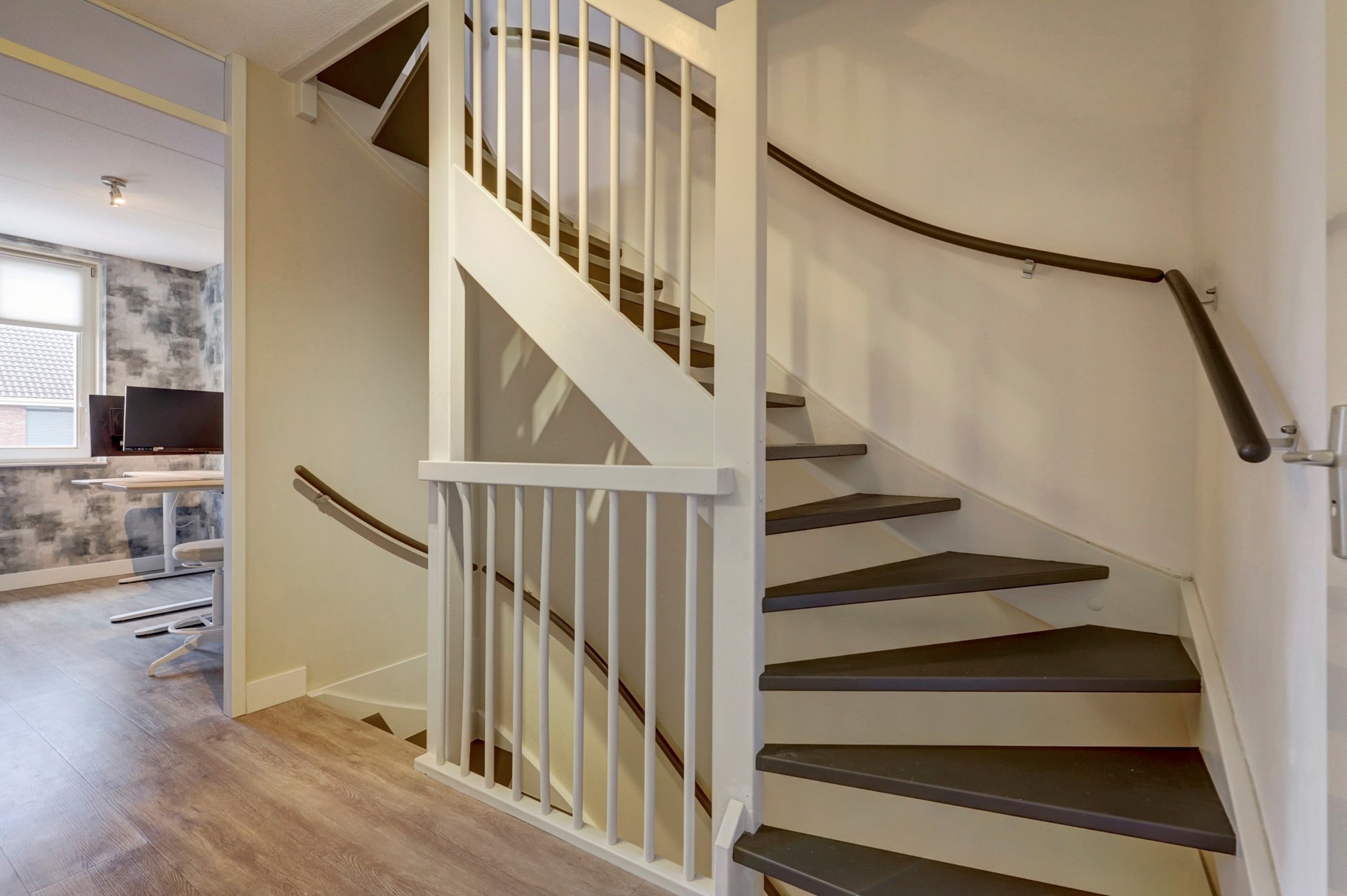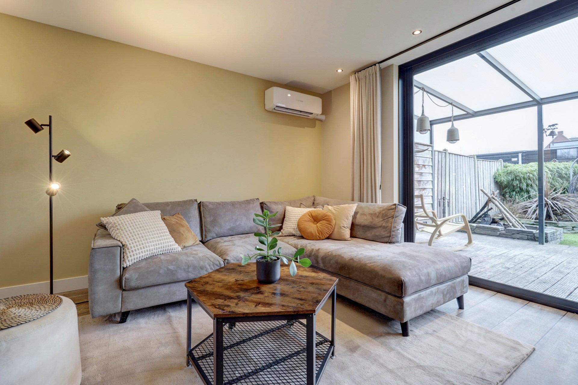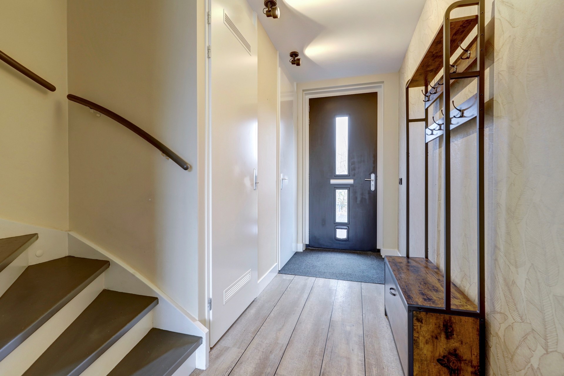 Entree, ruime hal met meterkast, opbouwspotjes en toegang tot een modern toilet met fonteintje en de trapopgang. De royale woonkamer (ca. 30 m²) is tuingericht en strak afgewerkt met een fraaie PVC-vloer met brede planken en hoge plinten. Daarnaast beschikt de woonkamer over een praktische trapkast met schuifdeur, een vaste vakkenkast, inbouwspotjes en een airco-unit. Via de schuifpui loopt u zo de fraai aangelegde achtertuin in.