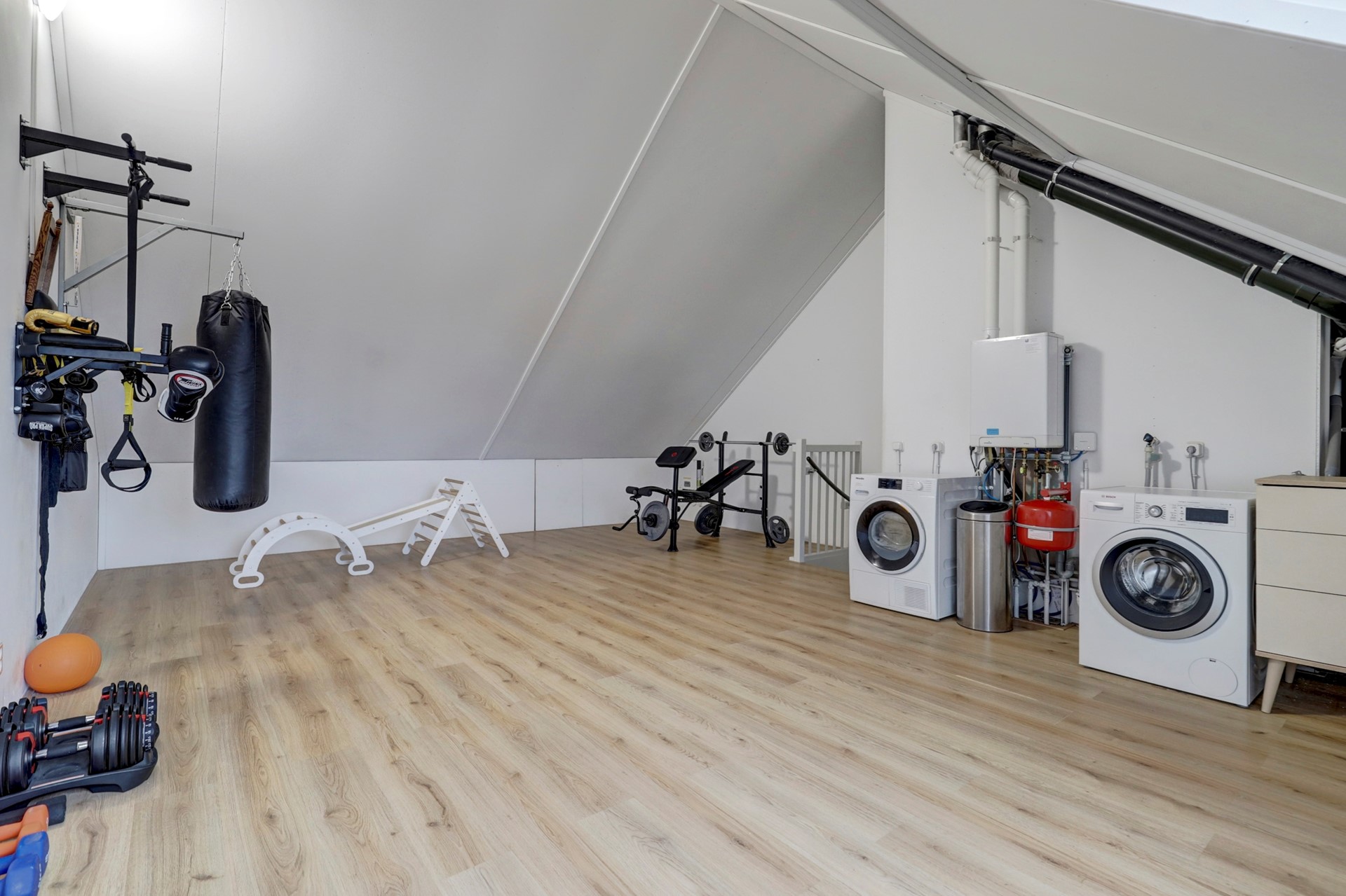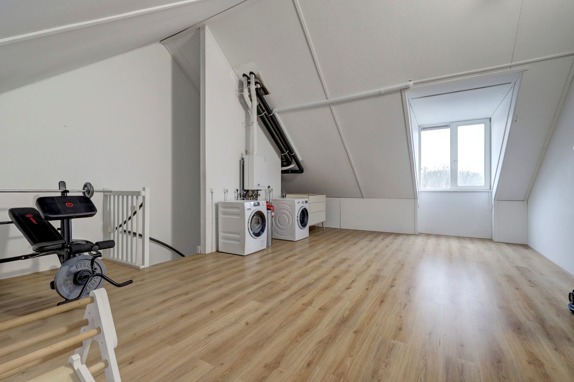 Daarnaast bevinden zich op deze verdieping de cv-installatie en de aansluitingen voor wasmachine en droger.