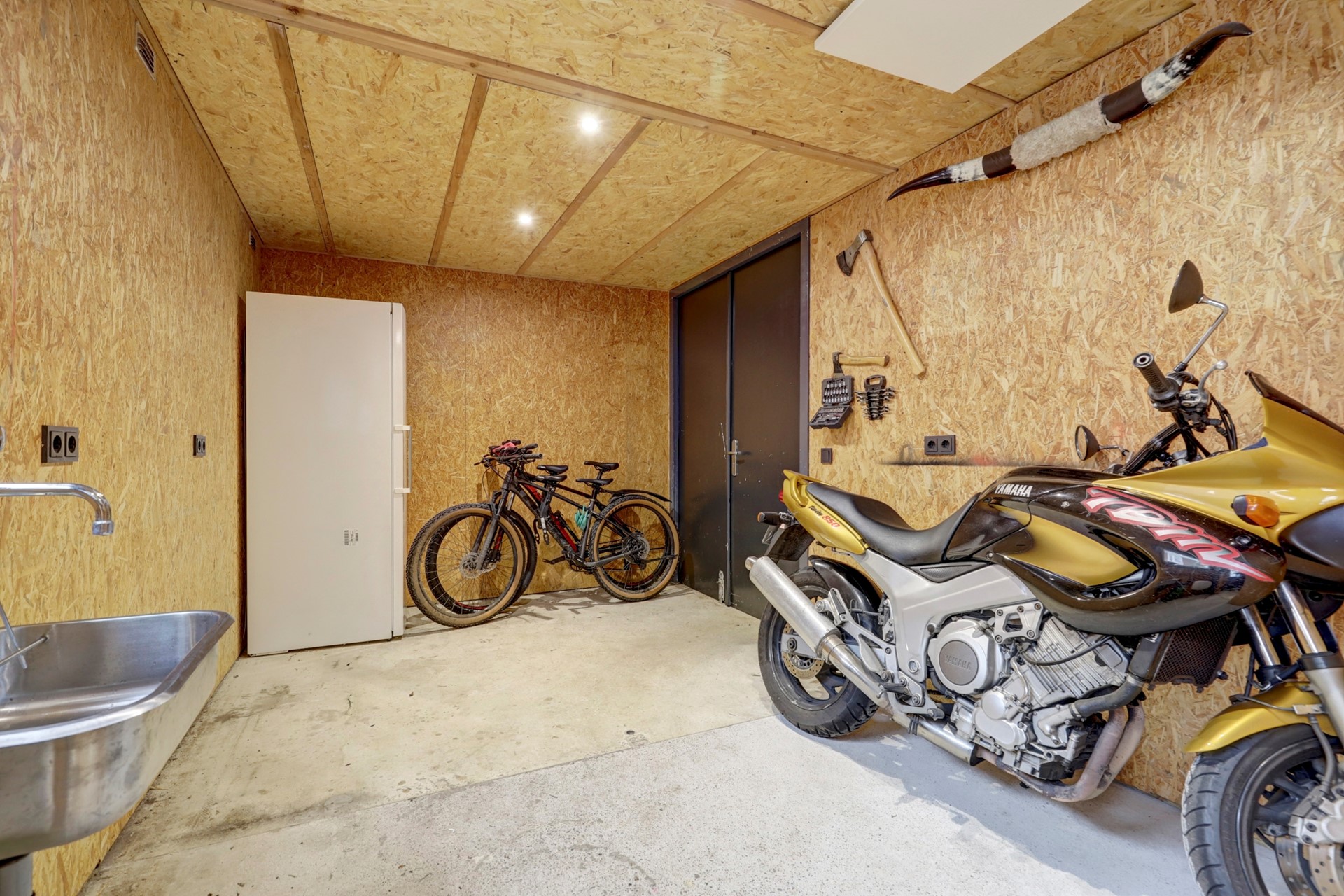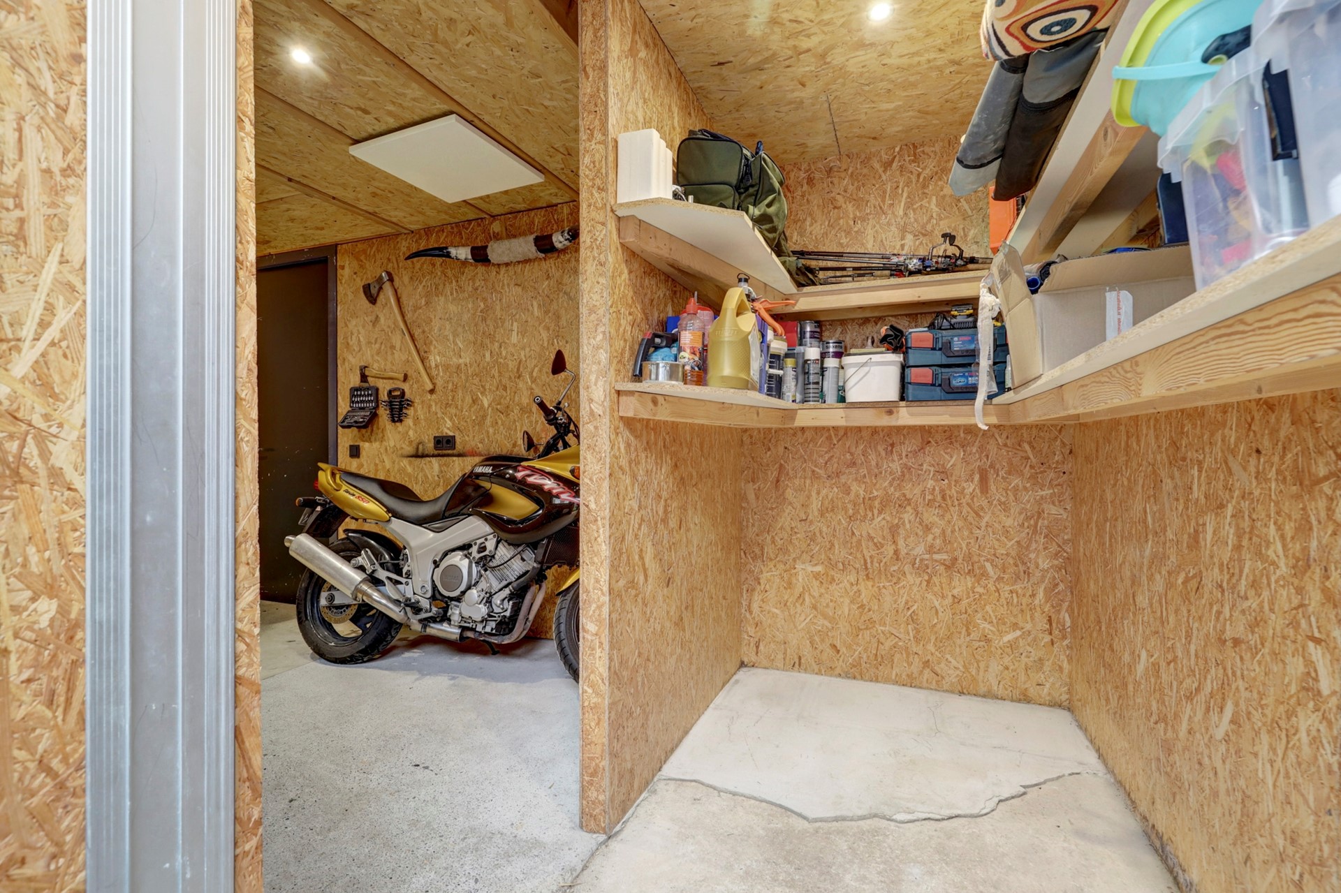 De berging is voorzien van verwarming (infraroodpaneel), water, elektra en een boiler. Dit maakt de ruimte ideaal voor bijvoorbeeld motorliefhebbers, een werkplaats of extra opslag. Via dubbele openslaande deuren aan de achterzijde van de berging bereikt u het achtergelegen pad en de eigen parkeerplaats.