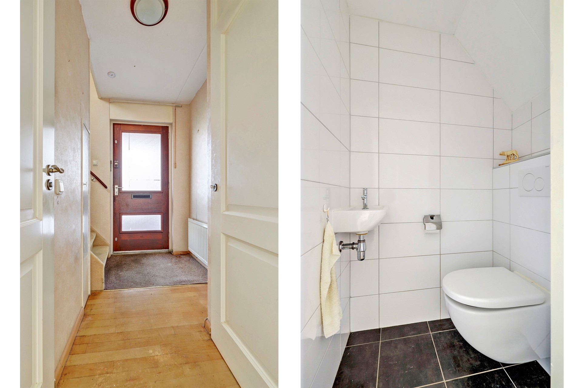 U komt binnen via de entree en hal met trapopgang, toilet met fontein en toegang tot de woonkamer.