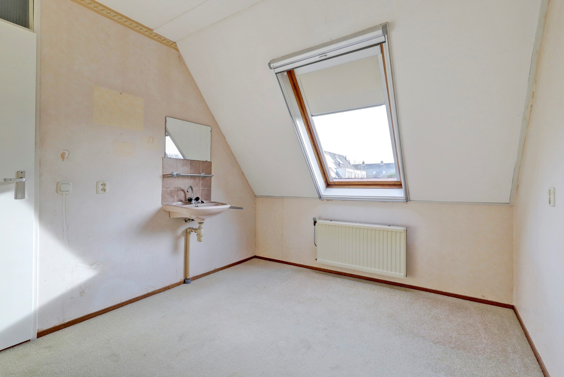 Via een vaste trap bereikt u de zolderverdieping. Deze is momenteel één open ruimte met de aansluiting voor de C.V.-installatie en een groot dakraam.
