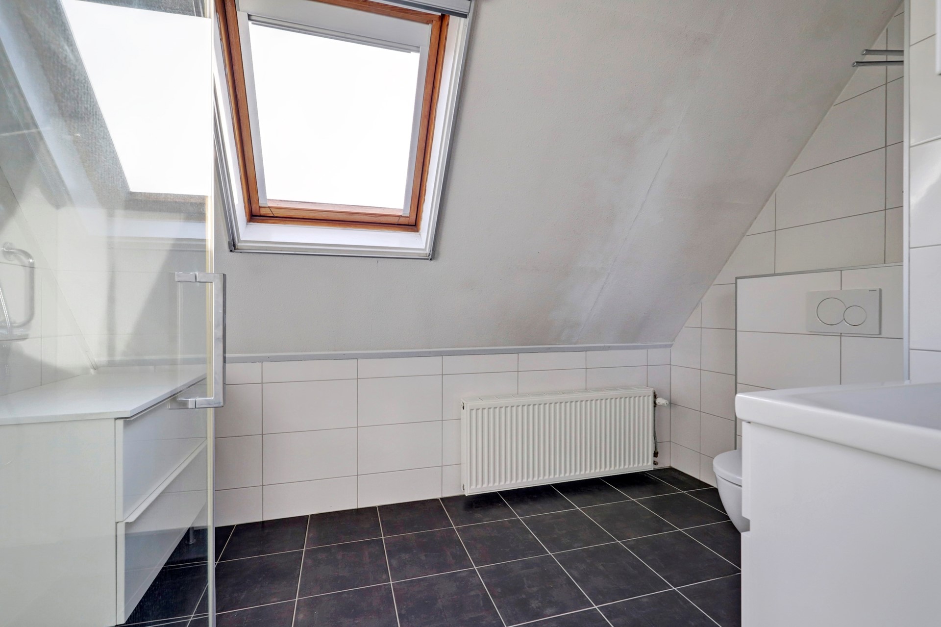 De badkamer is medio 2021 gerealiseerd en modern uitgevoerd met een wastafel met meubel, tweede toilet, badkamermeubel, douchecabine, radiator en een dakraam voor daglicht.