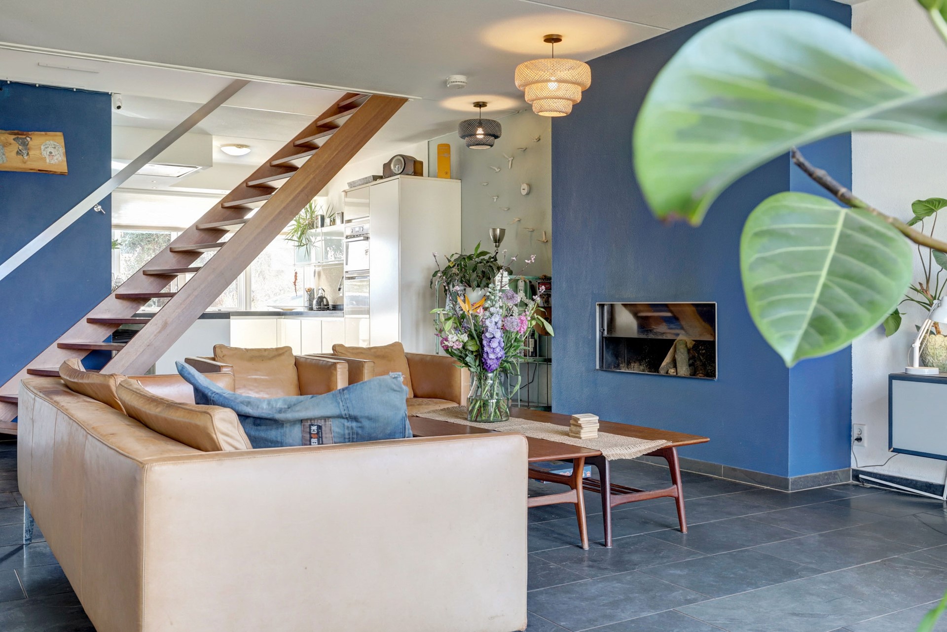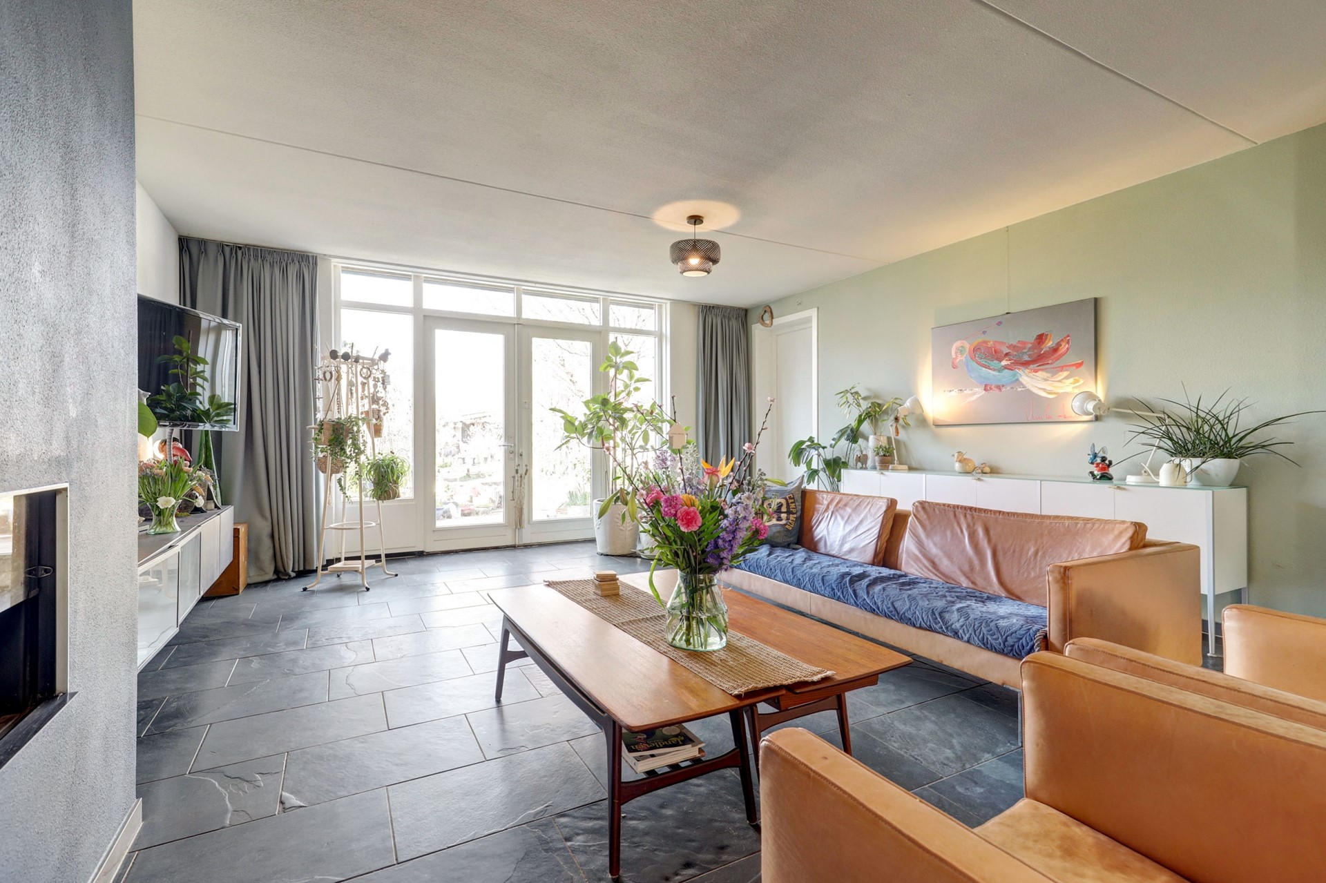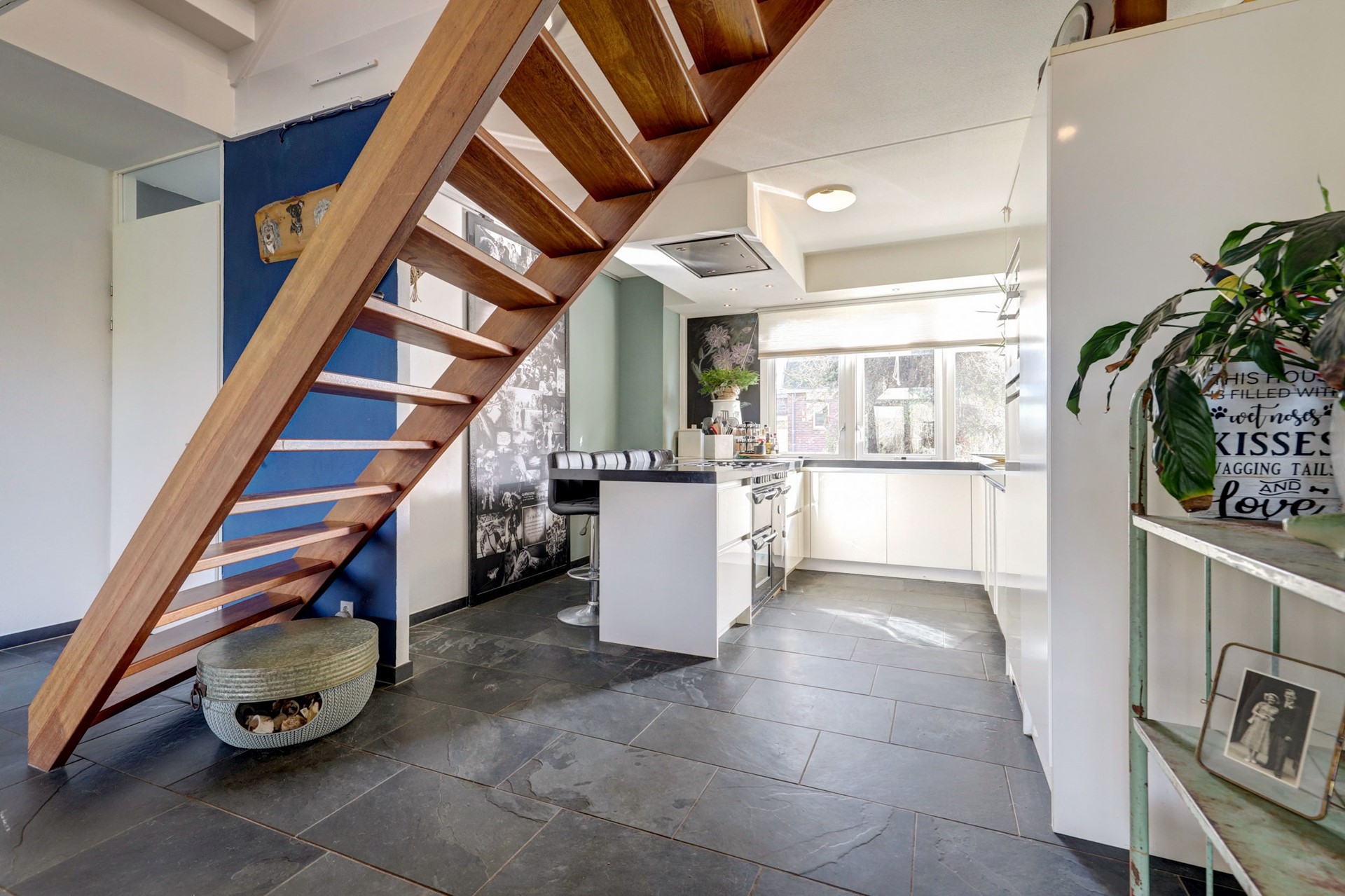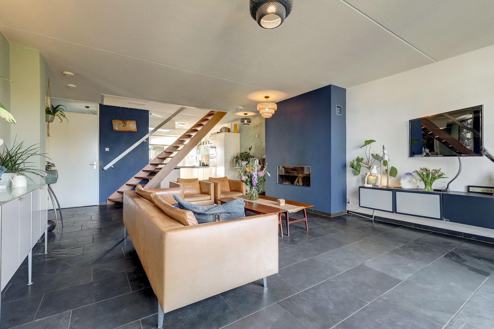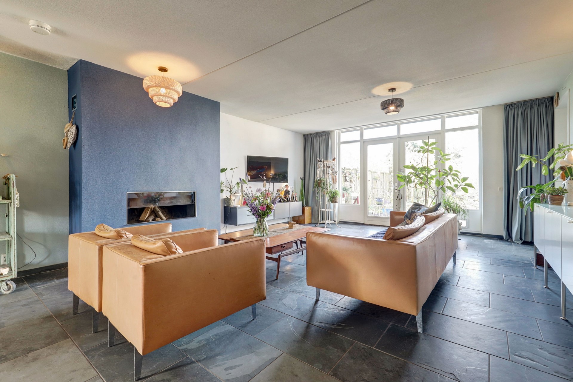 Via de entree kom je in de hal met meterkast, toilet en toegang tot de woonkamer. De ruime, tuingerichte woonkamer (ca. 44 m²) is licht en open, met grote raampartijen en een prettige verbinding met de keuken. De houtkachel zorgt voor extra sfeer.