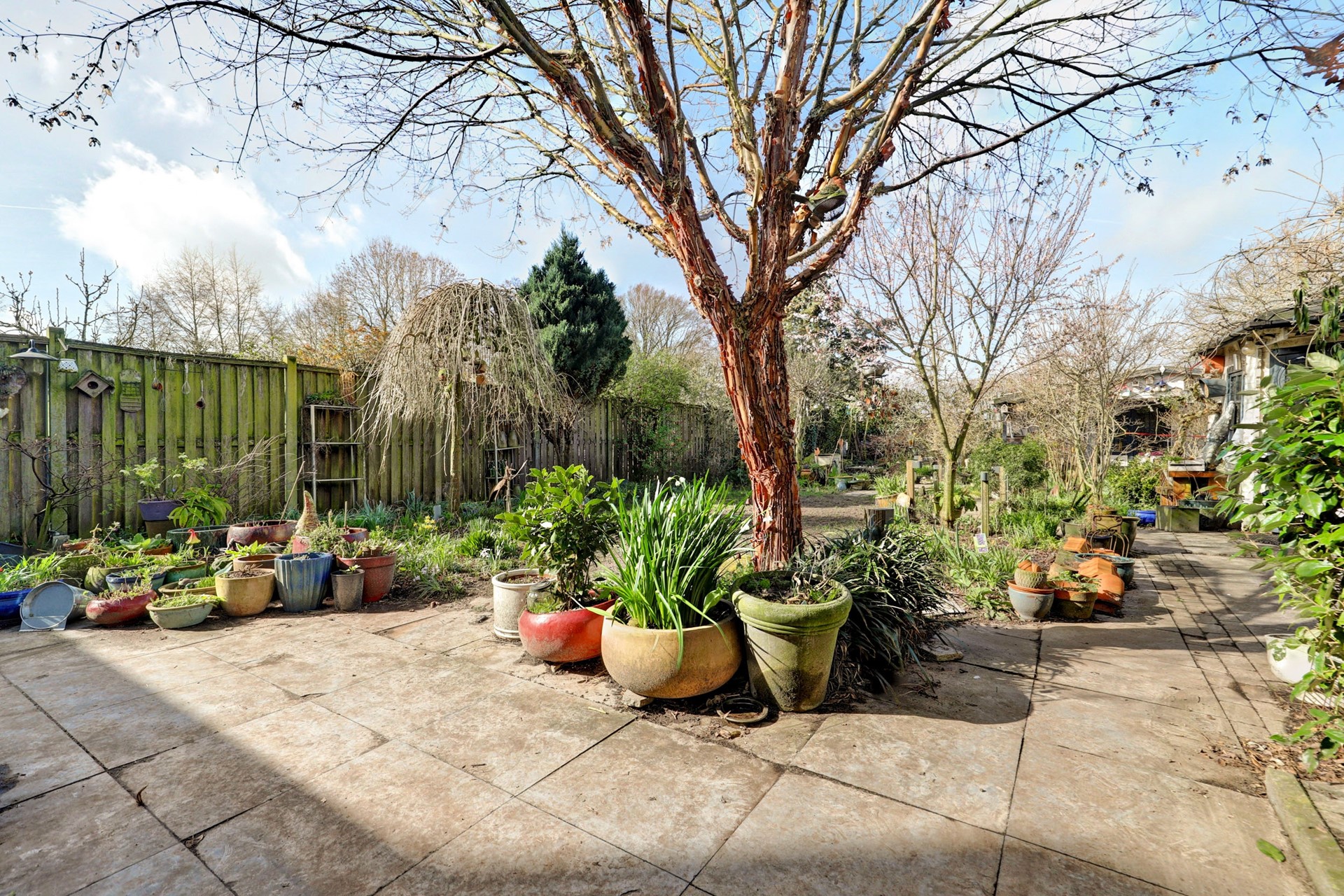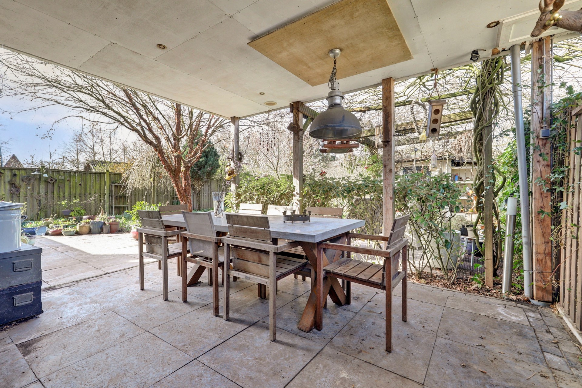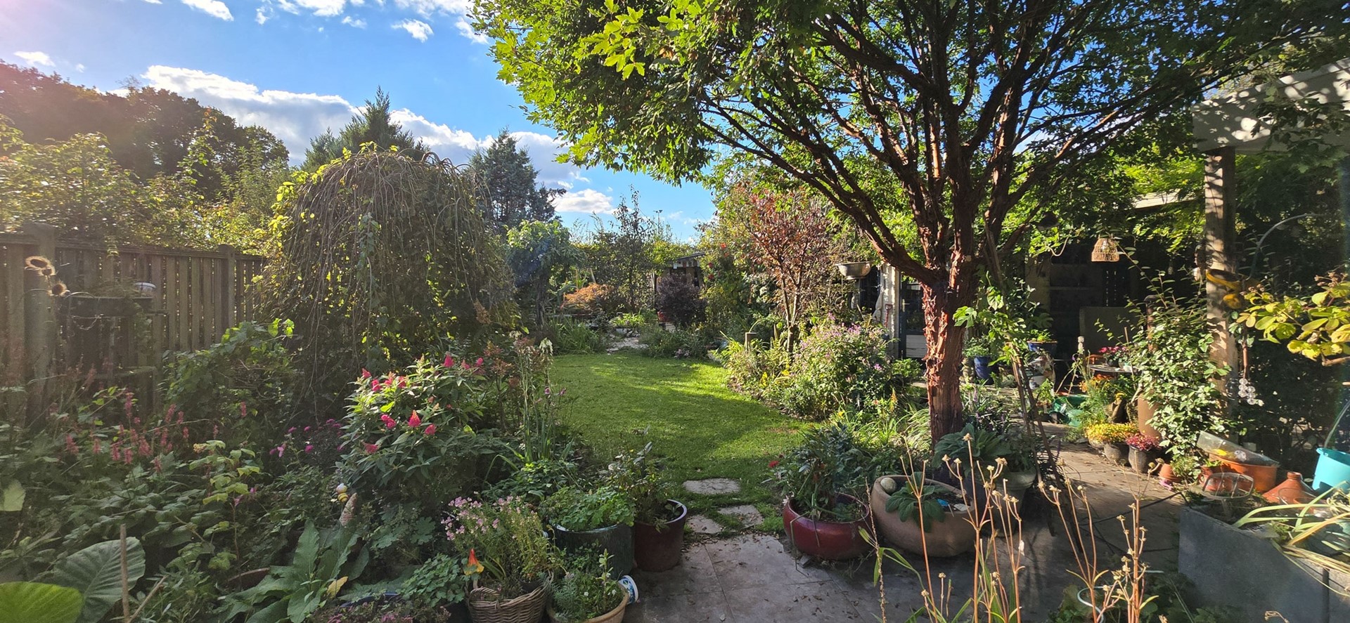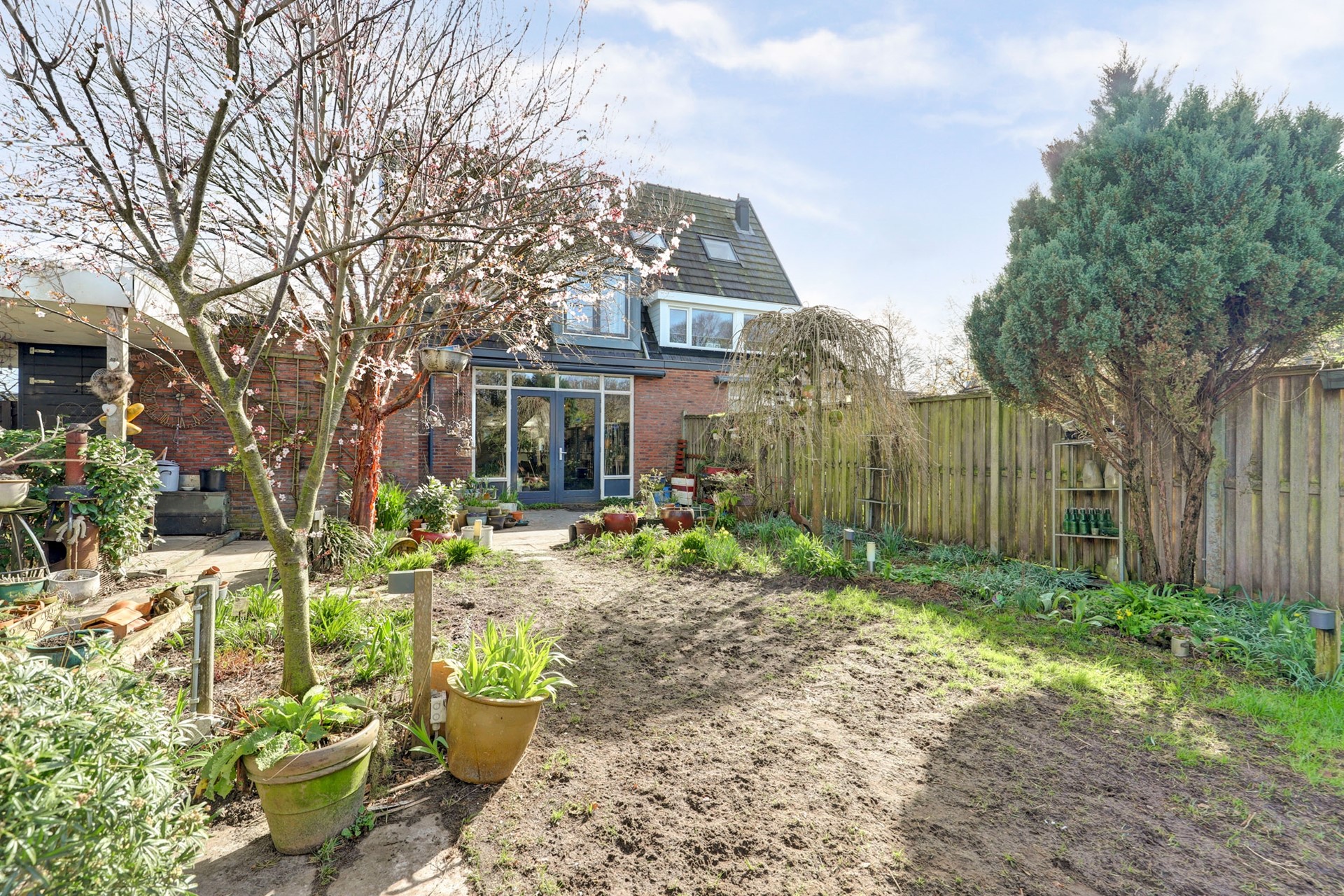 De diepe achtertuin (circa 29 meter diep en 13 meter breed) ligt op het zuidwesten en biedt volop zon, privacy en gebruiksmogelijkheden. De tuin is op natuurlijke wijze aangelegd met voornamelijk biologische beplanting, wat zorgt voor een levendige omgeving voor vogels, bijen en andere insecten. Met een tuinhuis, berging, overkapping en meerdere terrassen is er ruimte genoeg om te tuinieren, ontspannen, spelen of gewoon te genieten van het buitenleven.