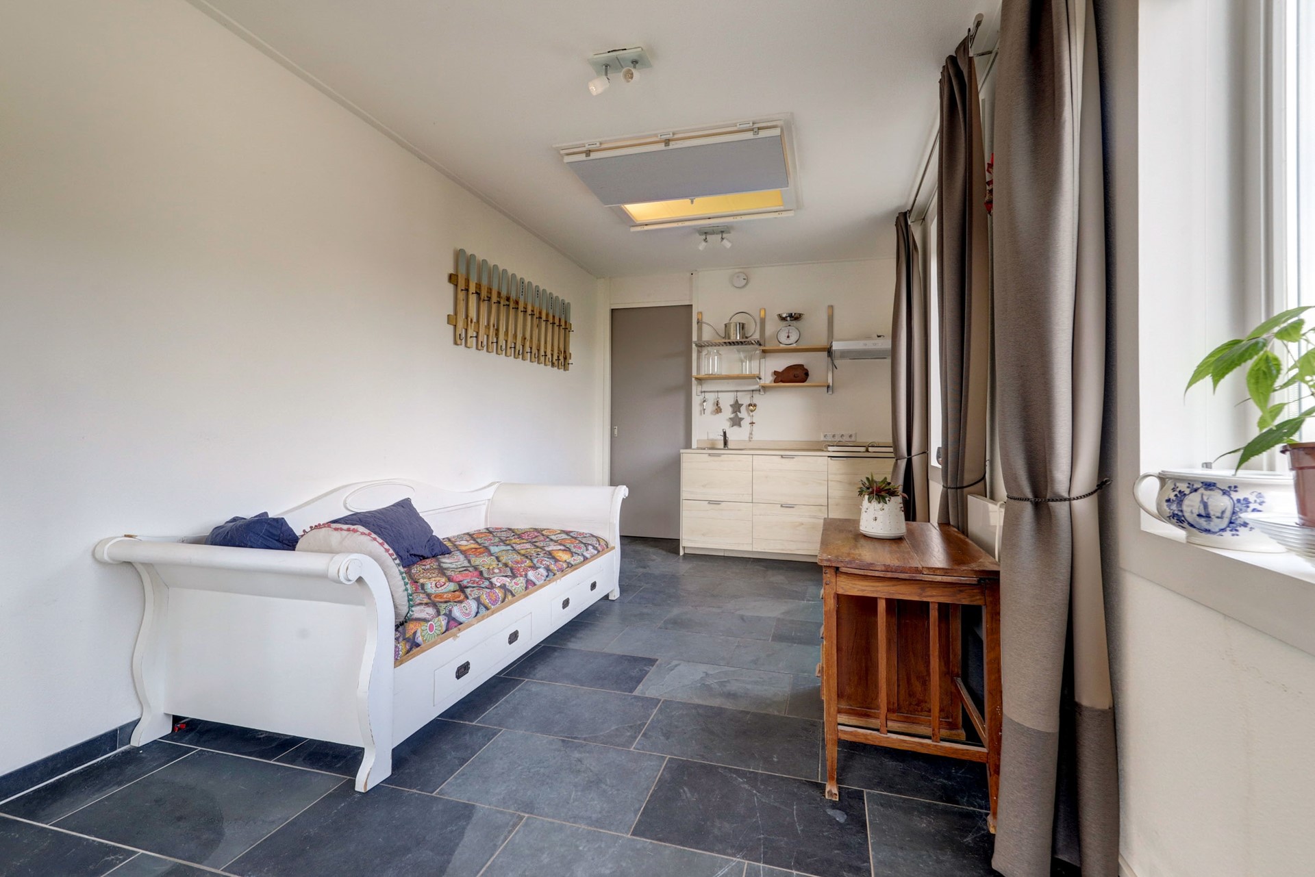 Een groot pluspunt is de levensloopbestendige indeling. Aan de rechterzijde is de woning uitgebouwd, waardoor er extra leefruimte is ontstaan. In deze aanbouw, met eigen ingang, bevindt zich een ruime slaapkamer met airconditioning en een keukenblokje, evenals een aparte badkamer met wastafel, douche, toilet en wasmachineaansluiting. Deze ruimte is multifunctioneel inzetbaar, bijvoorbeeld als werkruimte, mantelzorgunit, praktijk aan huis of speelkamer.