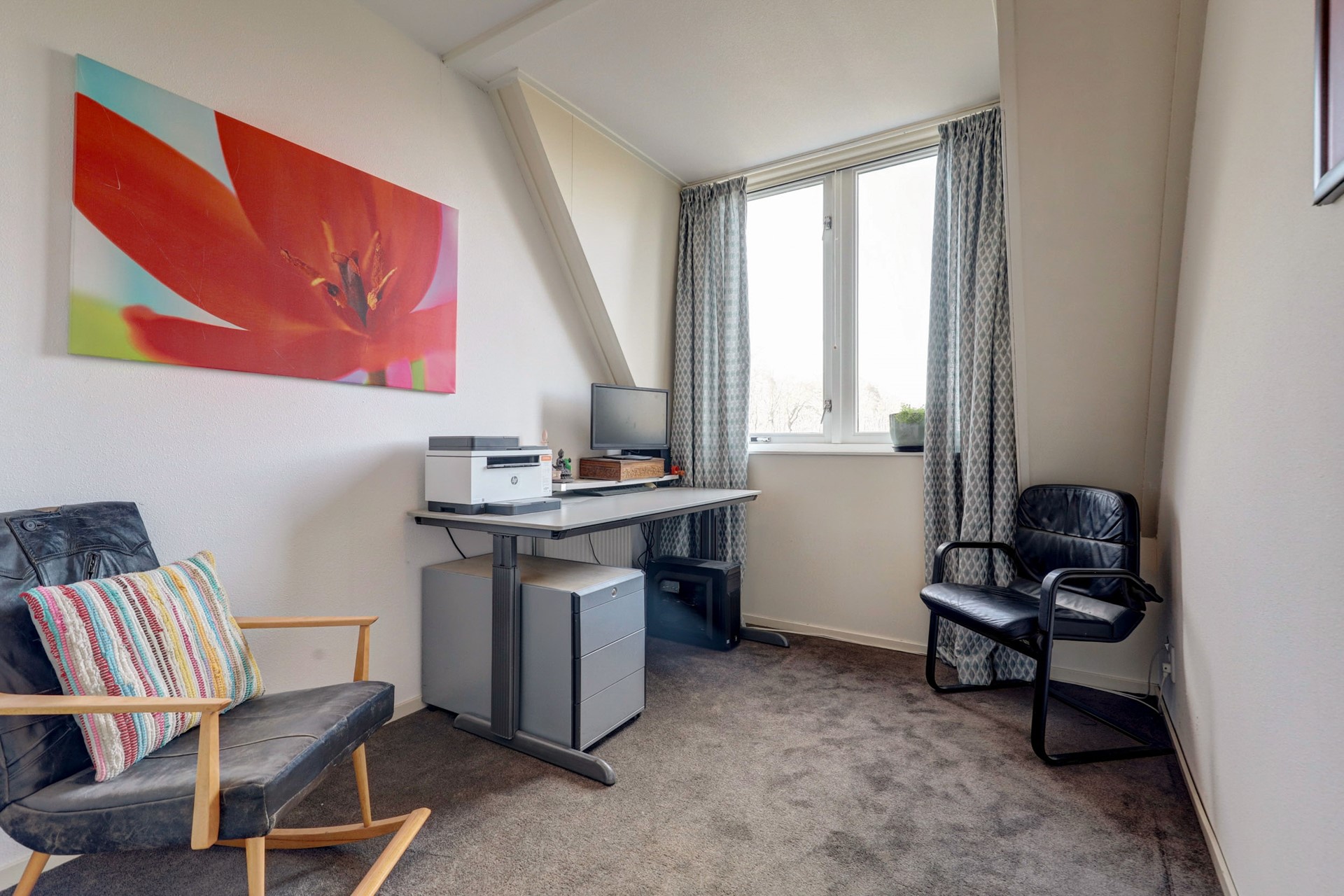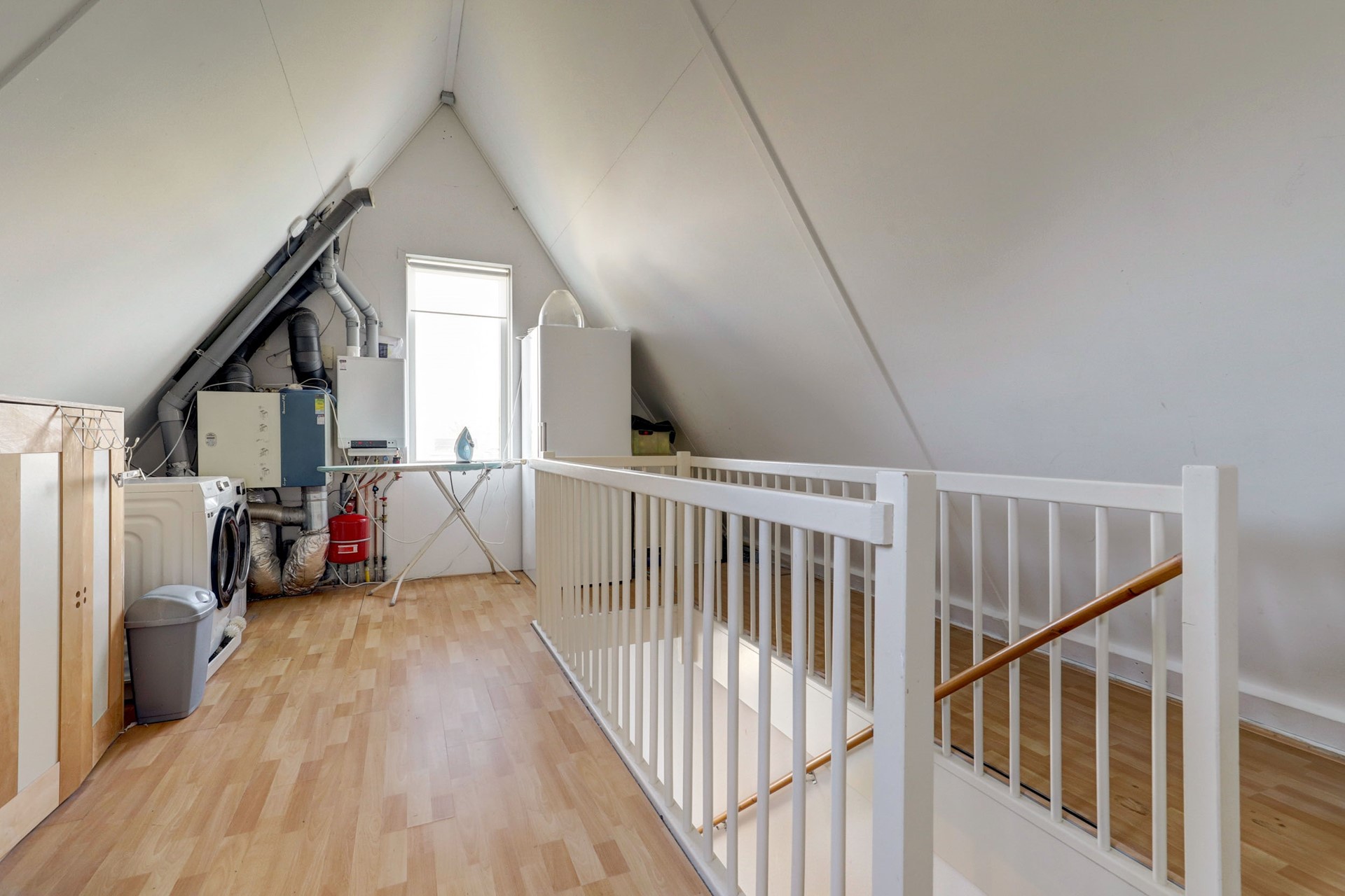 De zolder is een royale open ruimte waar eenvoudig een vierde slaapkamer of extra werkruimte gerealiseerd kan worden. Hier bevinden zich tevens de cv-installatie, HR-ventilatie-unit en aansluitingen voor wasmachine en droger.