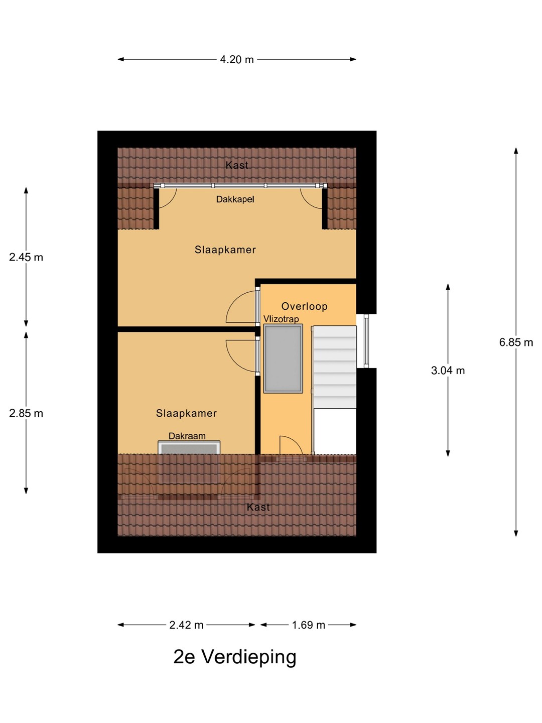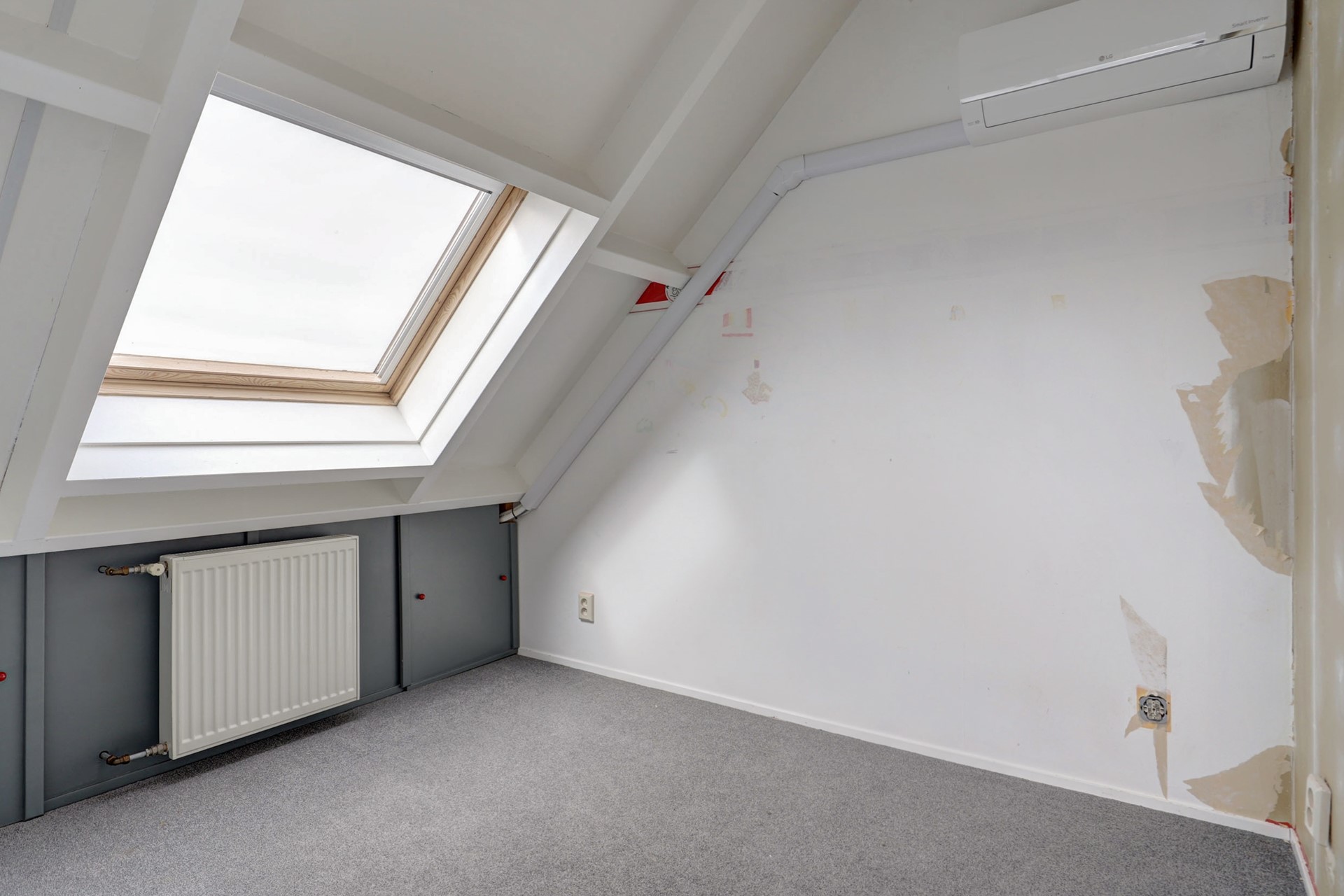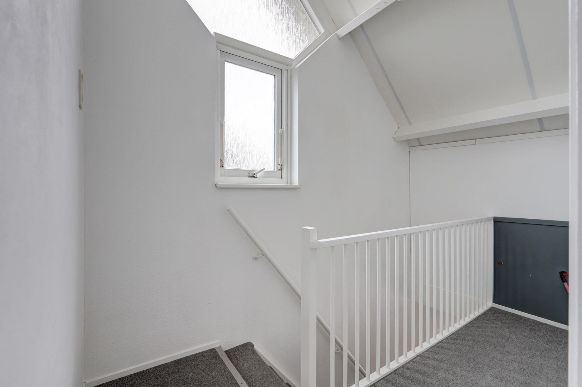 Overloop met toegang tot twee slaapkamers van circa 7 m² en 9 m². De slaapkamer aan de achterzijde is voorzien van een dakkapel, wat zorgt voor extra ruimte en licht. Daarnaast zorgt het grote raam in de punt van het dak voor een natuurlijke lichtinval op deze verdieping. Via een vlizotrap is de vliering bereikbaar, ideaal voor het opbergen van seizoensspullen. Daarnaast beschikken beide kamers over praktische bergruimte achter de knieschotten. Hierdoor wordt de aanwezige loze ruimte optimaal benut