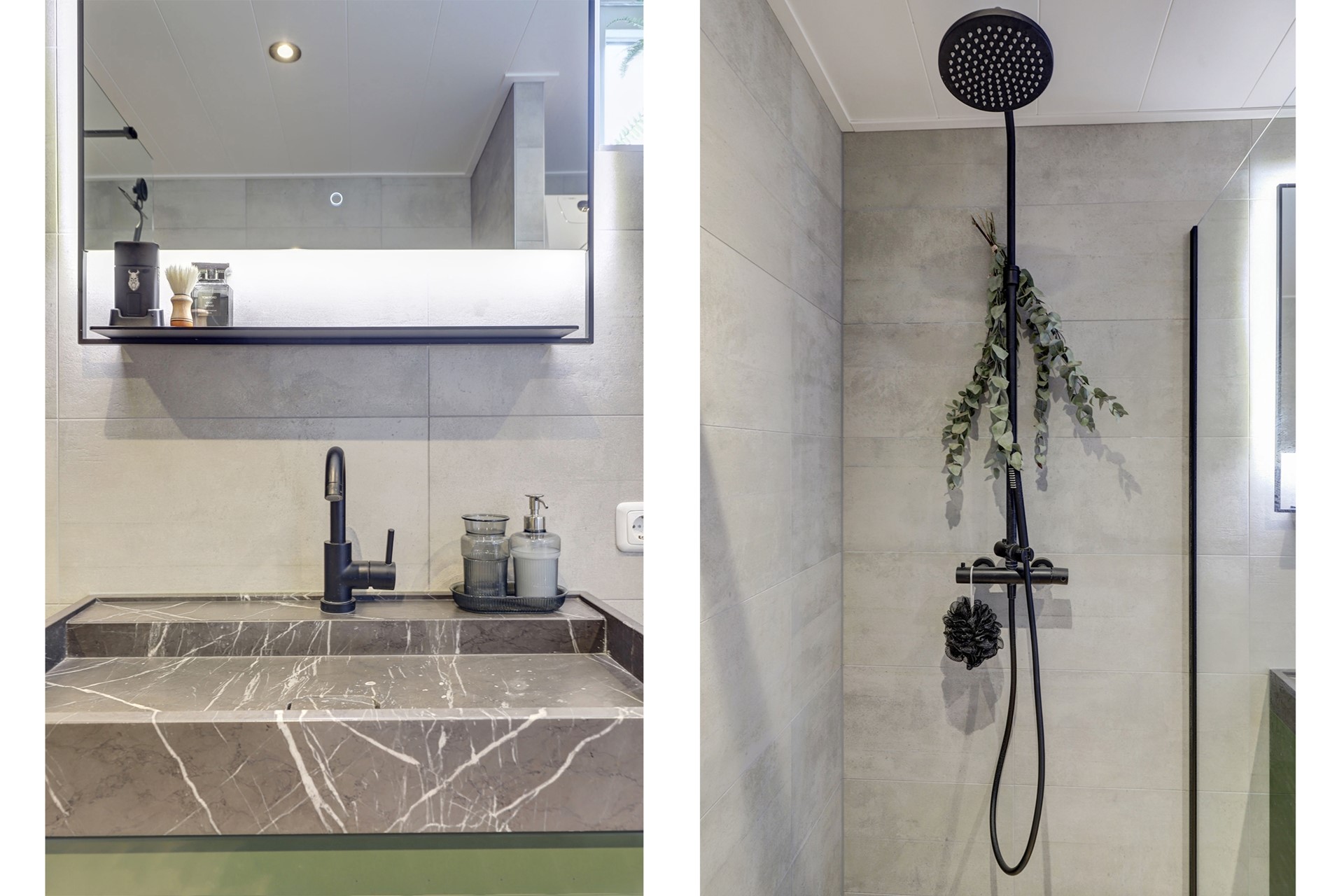 Vanuit de keuken bereik je het toilet, de badkamer en de achtertuin. De badkamer is in 2023 vernieuwd en stijlvol afgewerkt met fraai tegelwerk. Hier vind je een natuurstenen wastafel met meubel, een tweede toilet, een ruime inloopdouche, vloerverwarming, designradiator, mechanische ventilatie en aansluitingen voor wasmachine en droger.