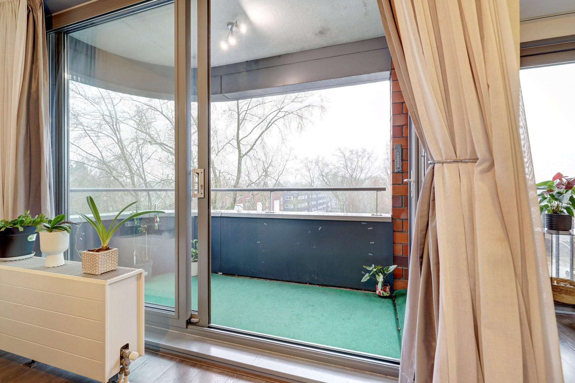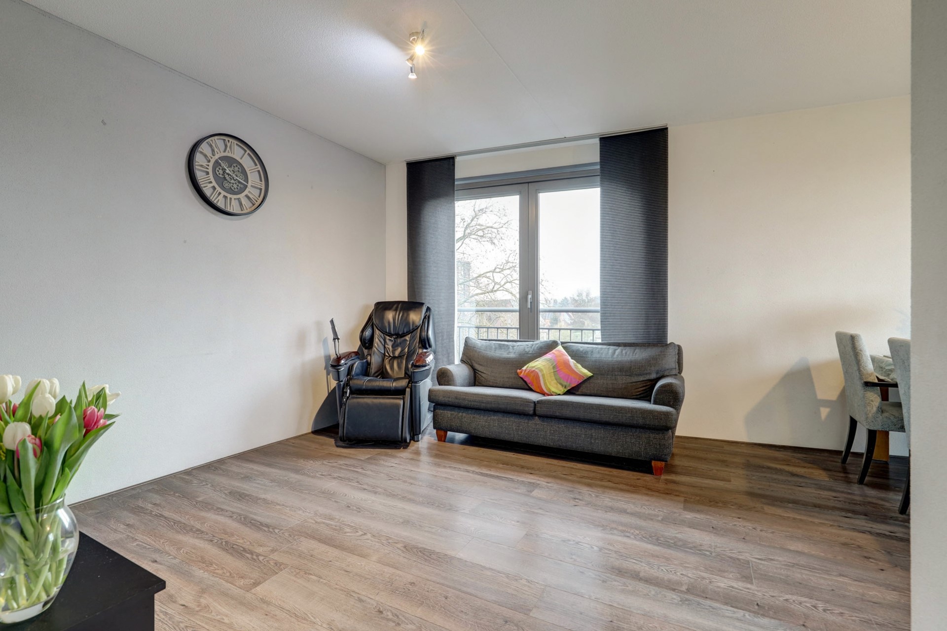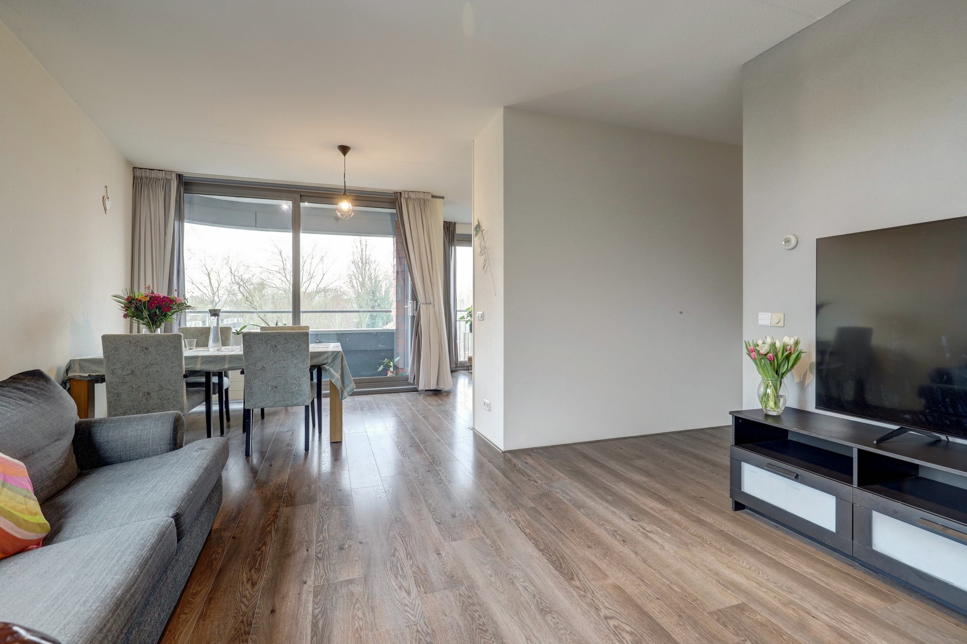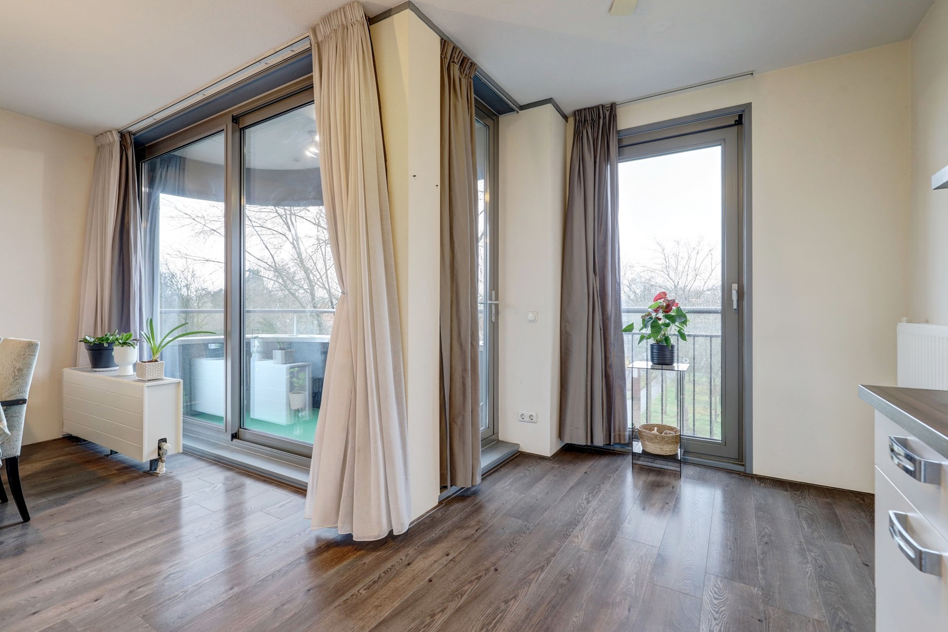 De woonkamer vormt het hart van de woning en kenmerkt zich door de grote hoeveelheid lichtinval dankzij de kamerhoge ramen en deuren. Via de schuifpui stap je zo het zonnige balkon op het zuidoosten op, waar je kunt genieten van een vrij uitzicht richting de Nobelweg. De openslaande deuren aan de oostzijde zorgen bovendien voor een extra Frans balkon en versterken het ruimtelijke gevoel.