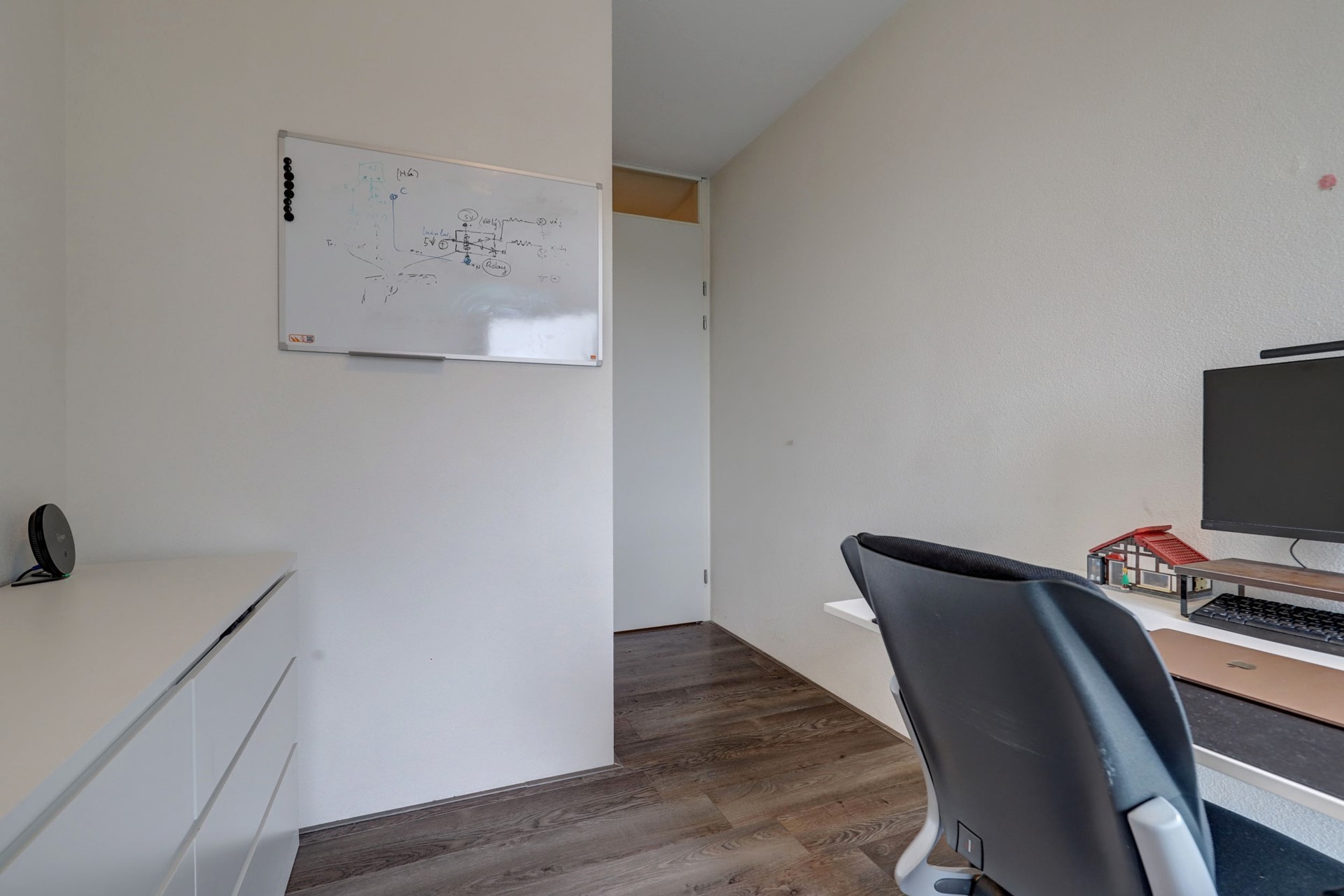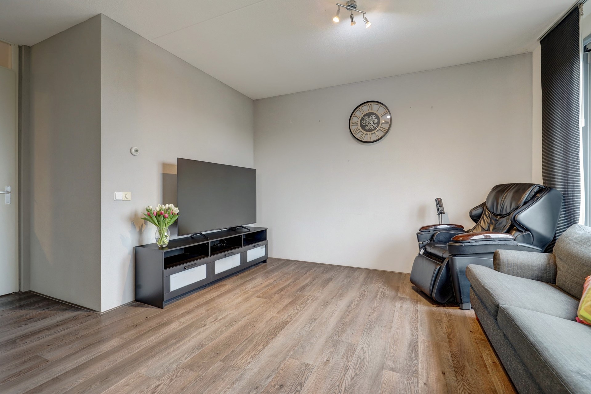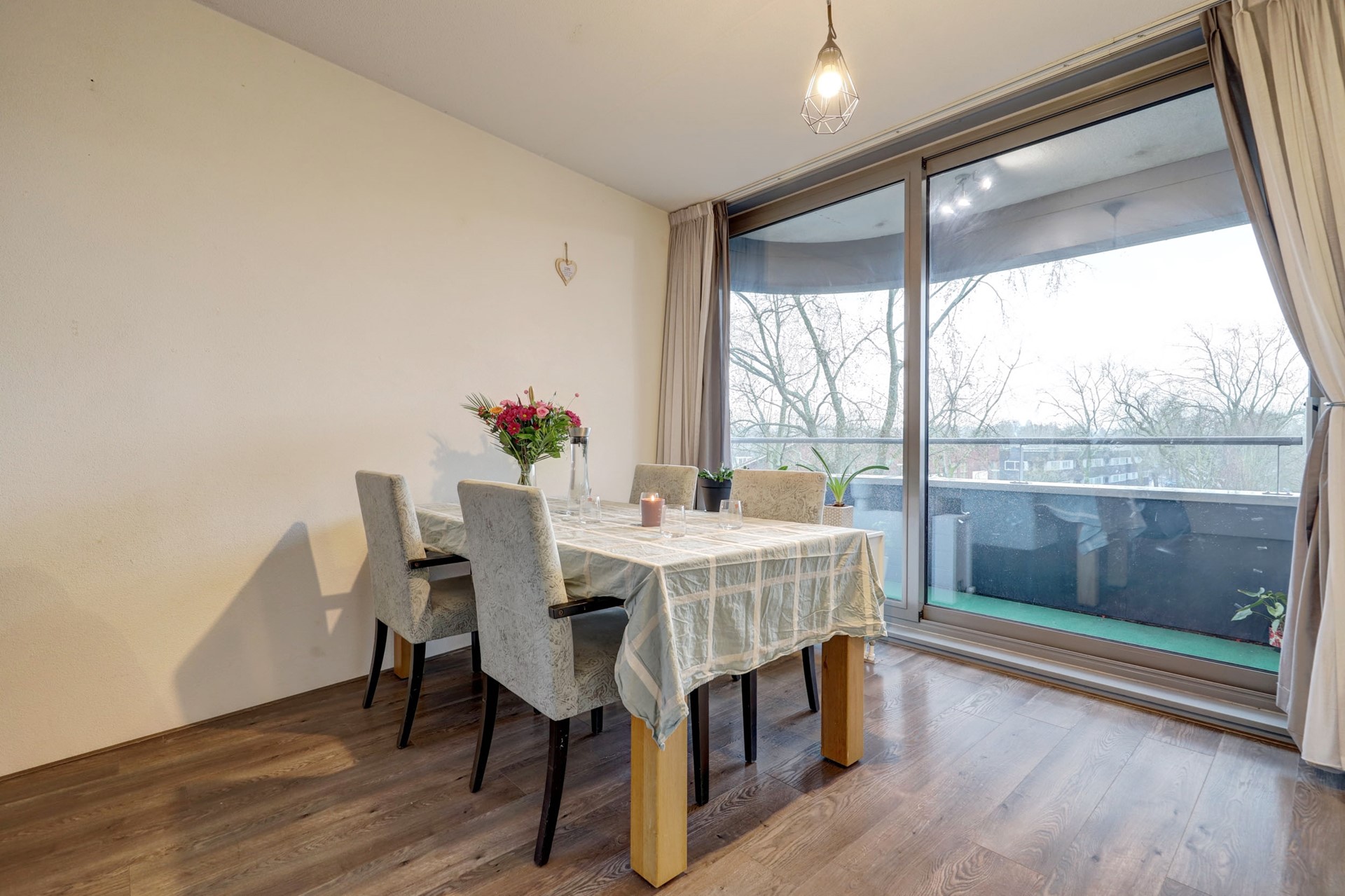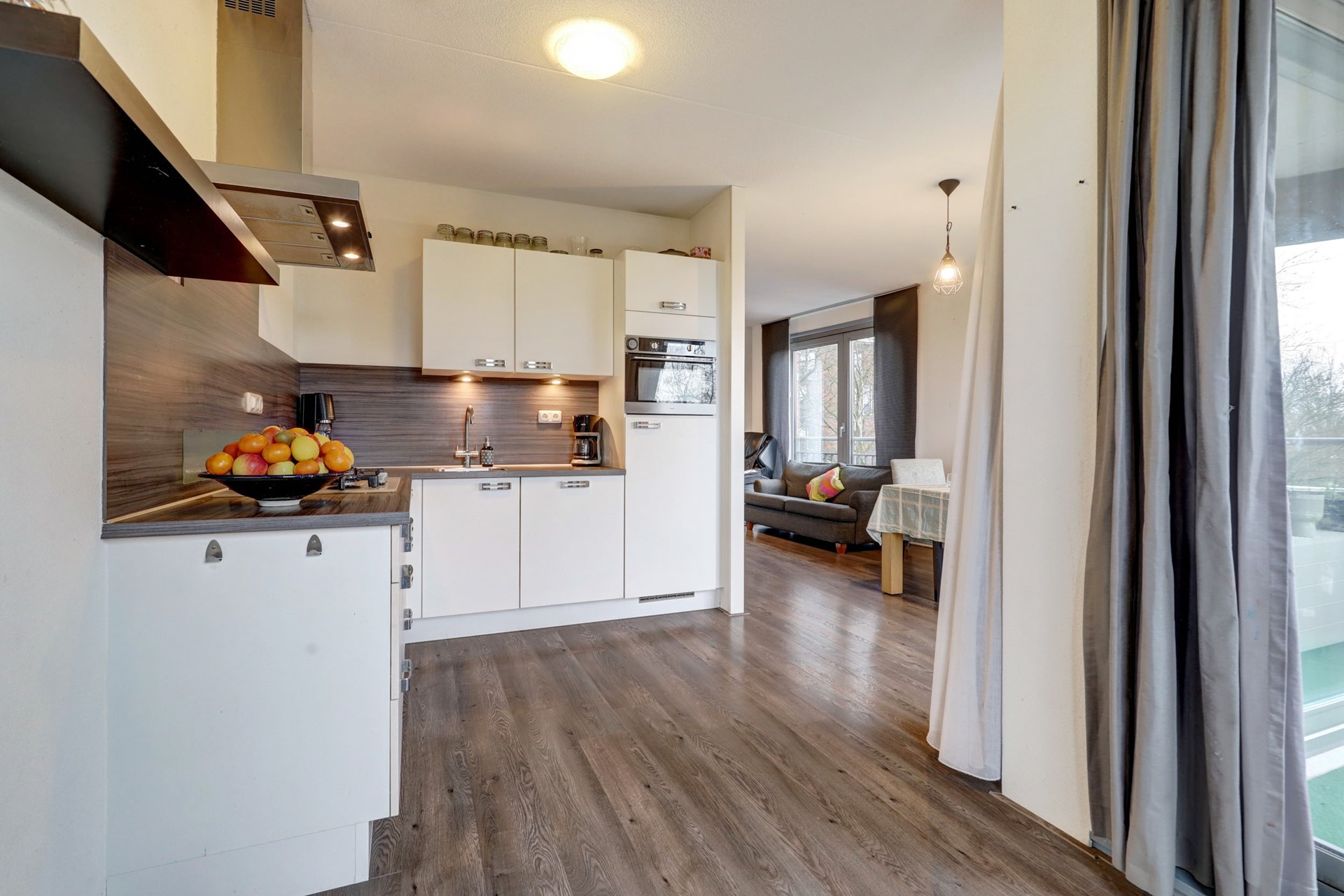 De woonkamer vormt het hart van de woning en kenmerkt zich door de grote hoeveelheid lichtinval dankzij de kamerhoge ramen en deuren. Via de schuifpui stap je zo het zonnige balkon op het zuidoosten op, waar je kunt genieten van een vrij uitzicht richting de Nobelweg. De openslaande deuren aan de oostzijde zorgen bovendien voor een extra Frans balkon en versterken het ruimtelijke gevoel.