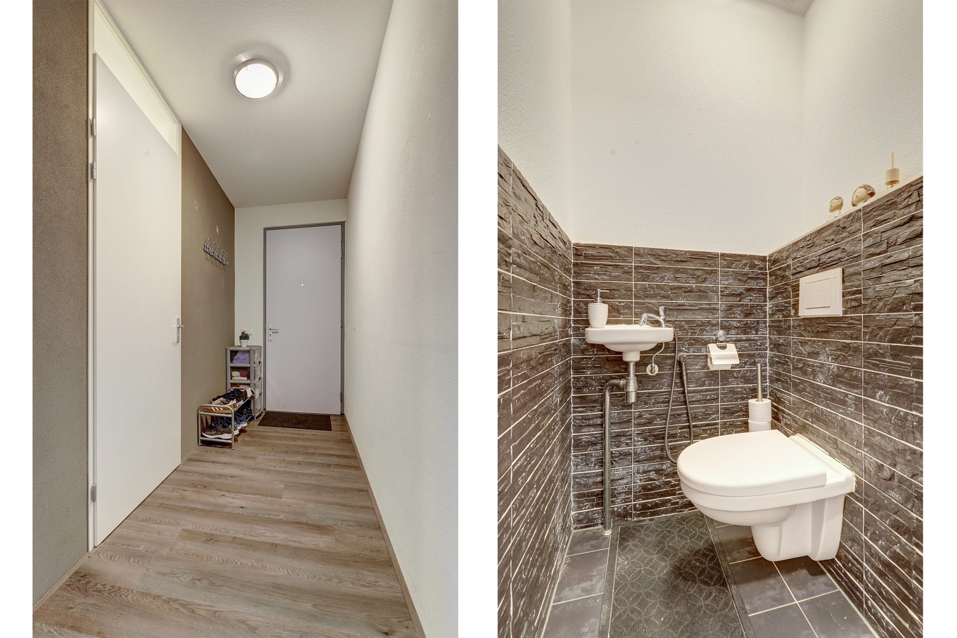 Binnen tref je een prettige en functionele indeling. De hal geeft toegang tot alle vertrekken, waaronder het moderne toilet en een praktische inpandige berging met cv-opstelling, mechanische ventilatie en aansluitingen voor wasmachine en droger.